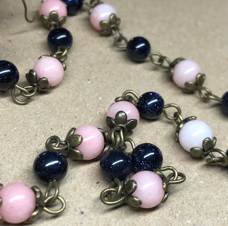 Goldstone, a semi-precious stone, is artificially created in a low oxygen environment to resemble a night sky full of stars. Believed to aid in goal achievement and enhance vitality.