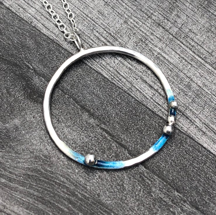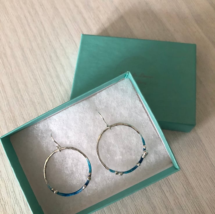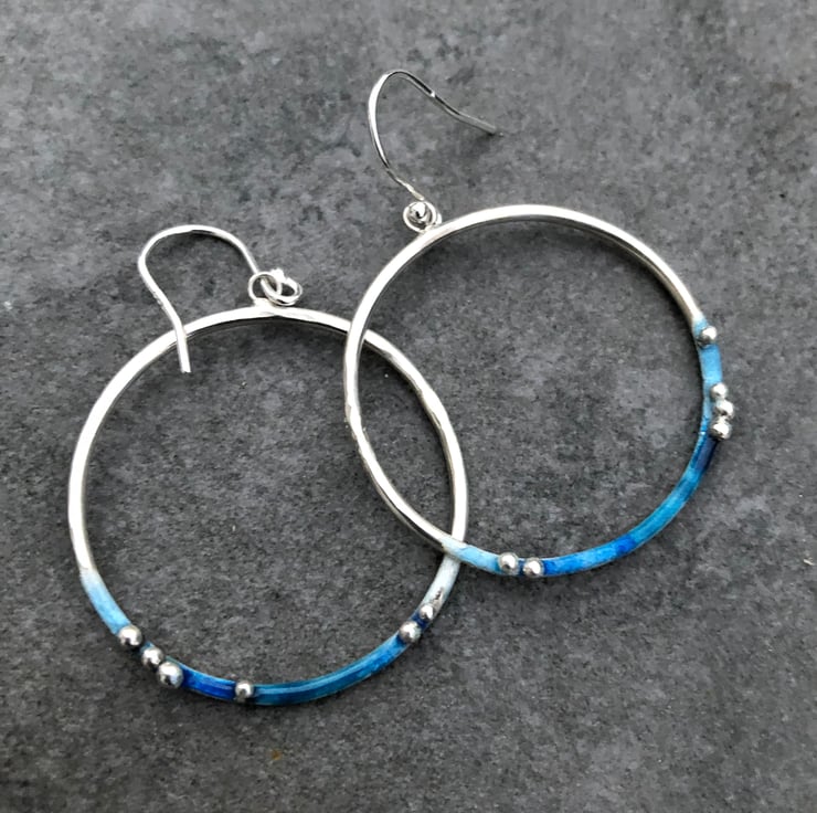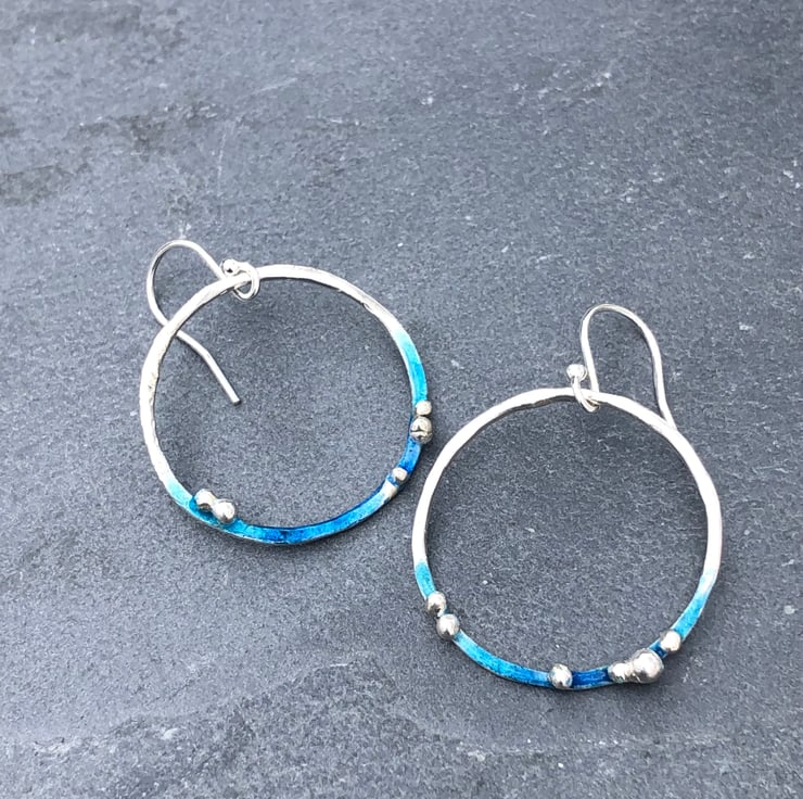 These Sterling Silver hoop earrings are inspired by blue water coastlines and the bubbling sea foam of the Mediterranean. I have hammer-textured the hoops and added enamel and silver ‘bubble’ detail on the lower part of the earring. These earrings look elegant but are strong and well made.