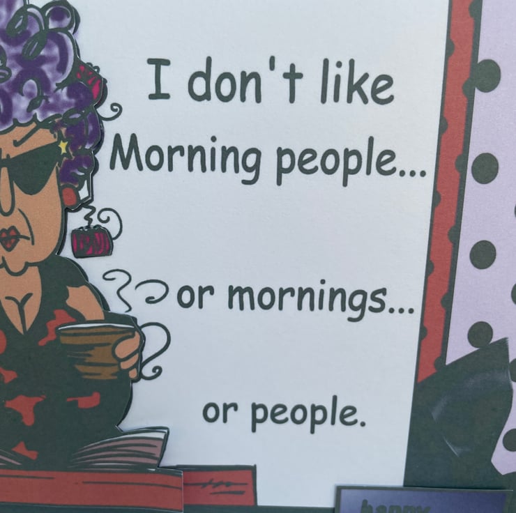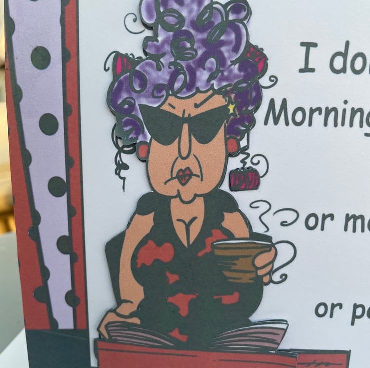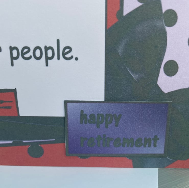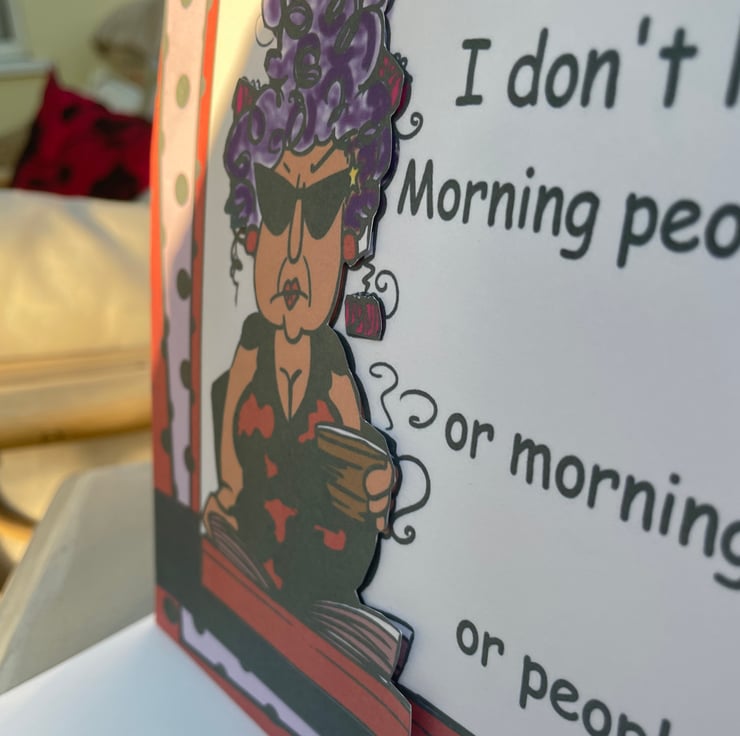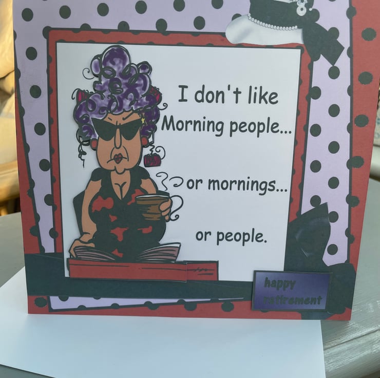 A day lots of people look forward to! This is a fabulous and funny card to celebrate someones retirement. This 20x20cm card features bright red and purple backgrounds with black polka dots. The main design is a grumpy lady reading a book and drinking coffee with her hair in rollers. The greeting says I don't like morning people... or mornings... or people. There is a separate greeting that says happy retirement. The inside is blank for your own greeting and allows loads of space for lots of people to sign and put there own message. Go on, give someone a giggle.