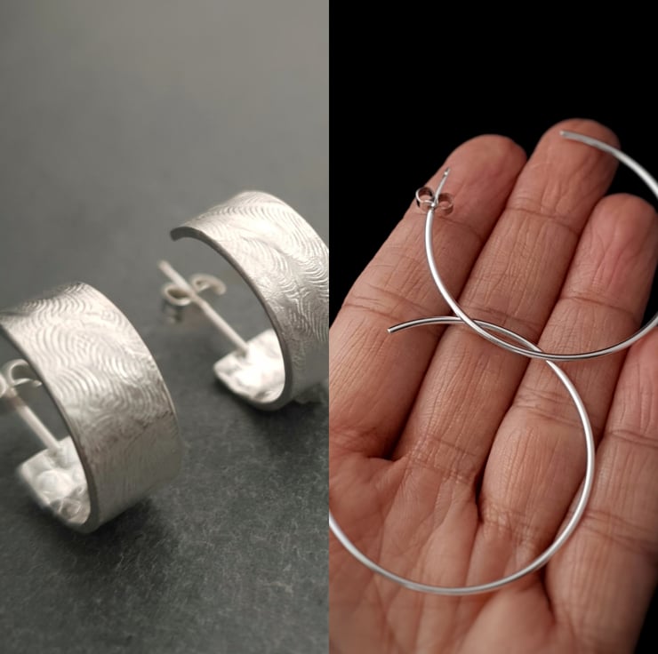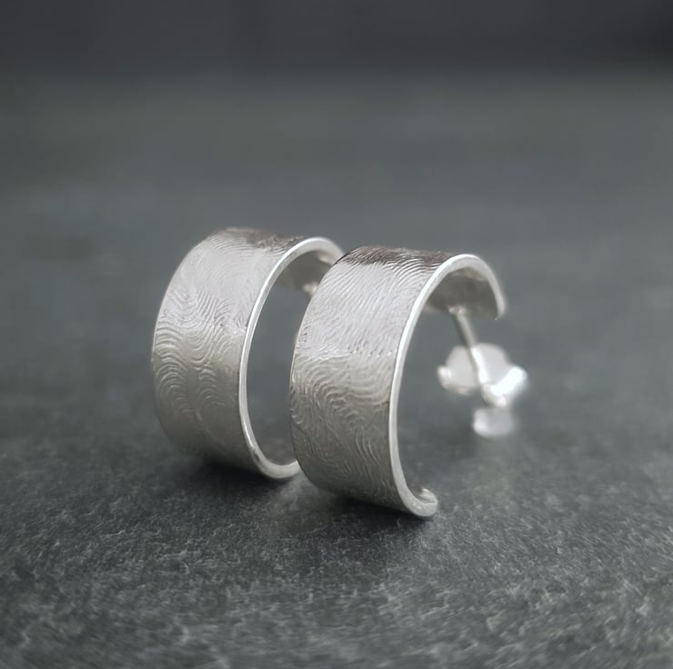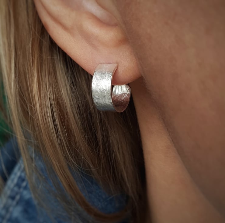 The smaller hoops are part of my Balance Me range with two applied textures representing earth and water. These hoops measure 6.2 mm in width and 1.4 cm in diameter with 0.9 mm thickness. The ear posts are 10 mm long and 0.8 mm thick with butterfly catches.