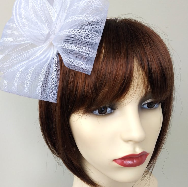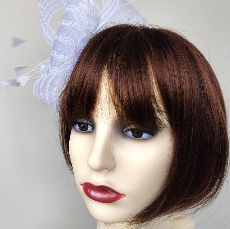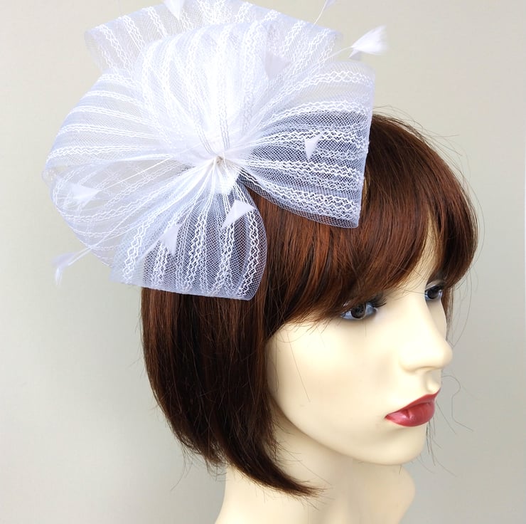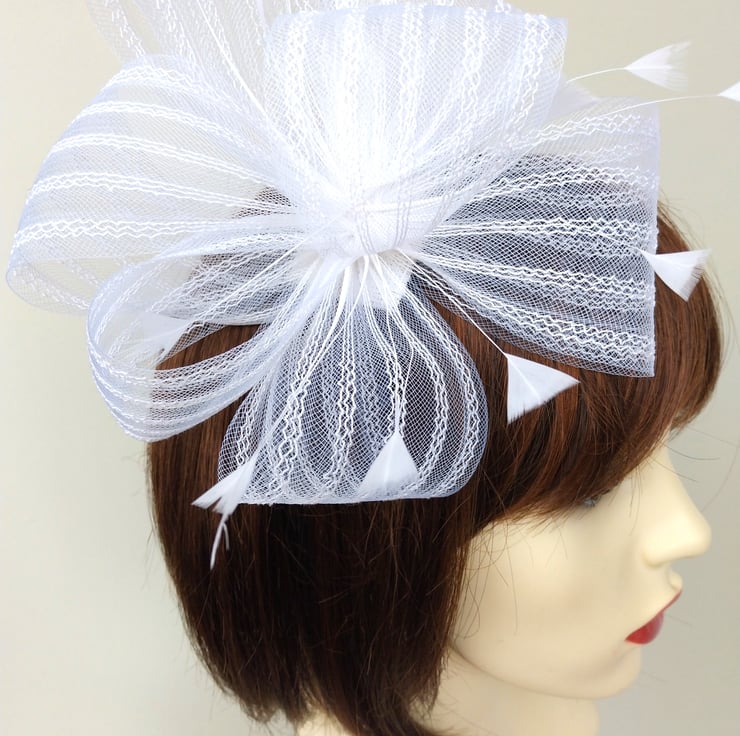This fascinator is made of white crinoline ribbon with fancy stitching running along the length. It is decorated with hand cut white feathers in small triangles. The fascinator sits on a thin silver-coloured metal hairband. It is worn on the right.
