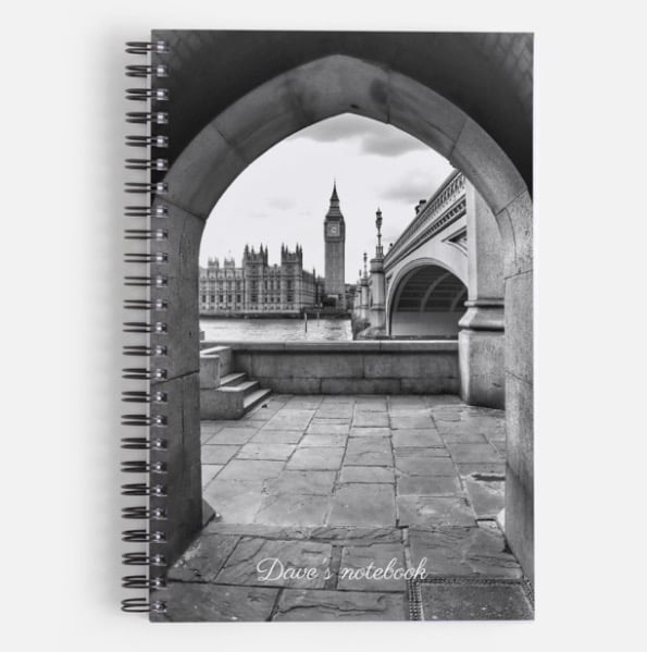 Start writing in style with this spiral-bound personalised notebook, featuring my black and white photo of Big Ben in London.