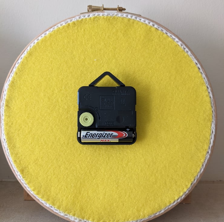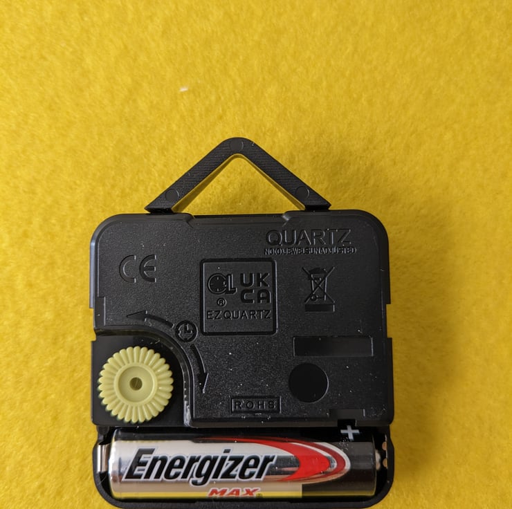 Internally, the clock mechanism is fastened to a circle of foamboard that provides a sturdy backing for the clock face too. The clock hands are made of white plastic and the second hand moves continuously with no sound.