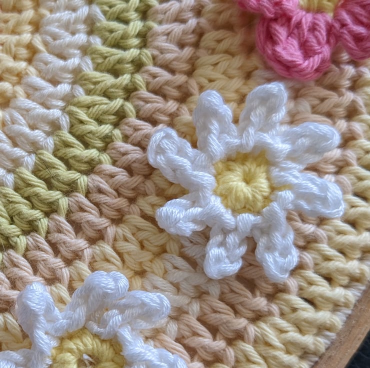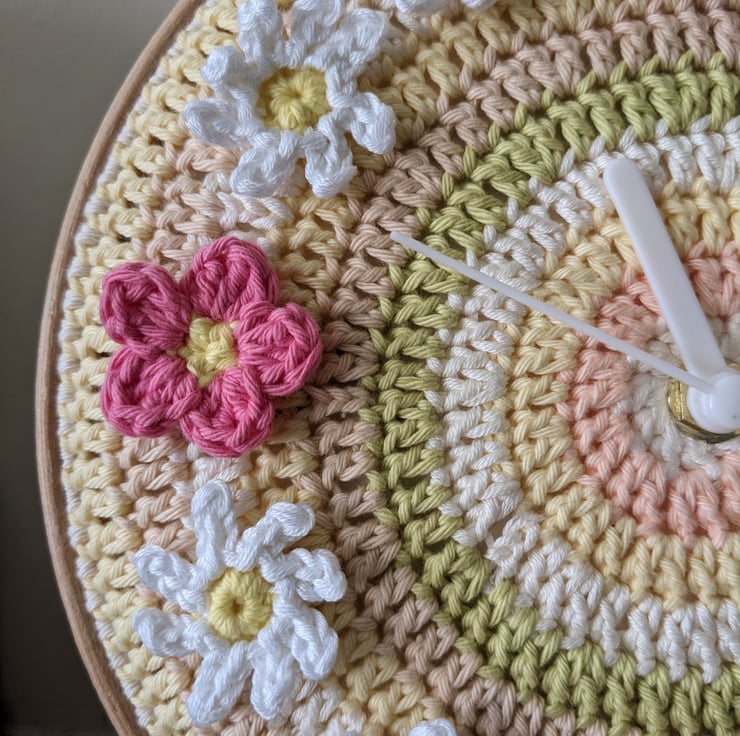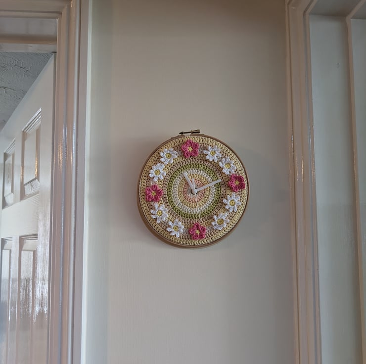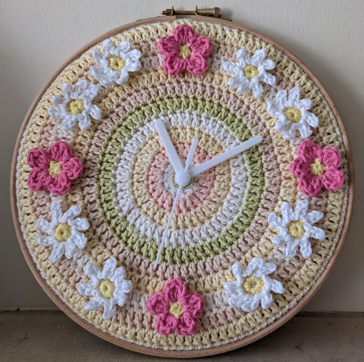 This pretty clock has a crocheted clock face made from cotton yarn in pastel colours and is decorated with crocheted white daisies and pink polyanthus flowers in place of numerals. It is attached to an 8 inch / 20cm round wooden embroidery hoop and backed with felt, handsewn to the edge of the crochet clock face on the back of the clock.