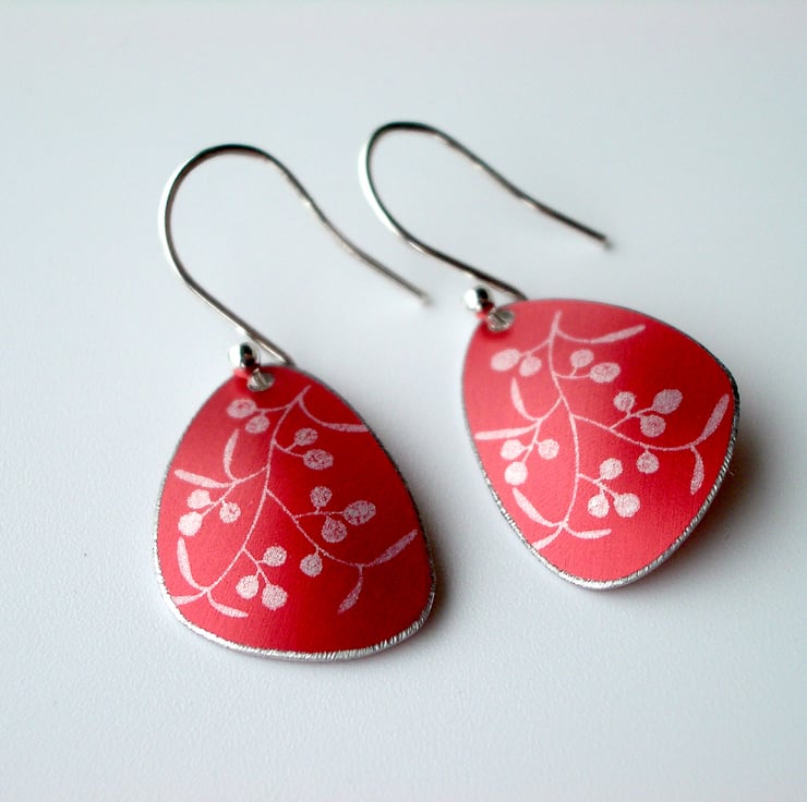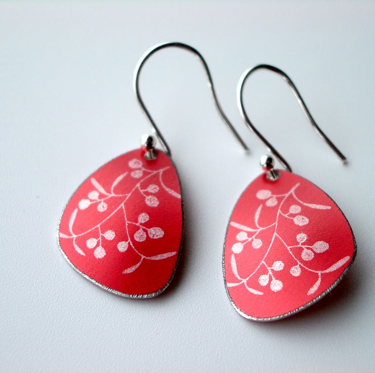 These pebble shaped berry earrings are made from aluminium which I have dyed a light red and printed with a white berry print. The dye is made permanent through heat and becomes a part of the metal. I saw pierce the pebble shape by hand and finish by doming and filing the edges. The earrings hang from sterling silver ear hooks and measure approximately 20mm x 14mm.