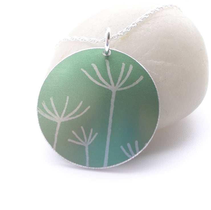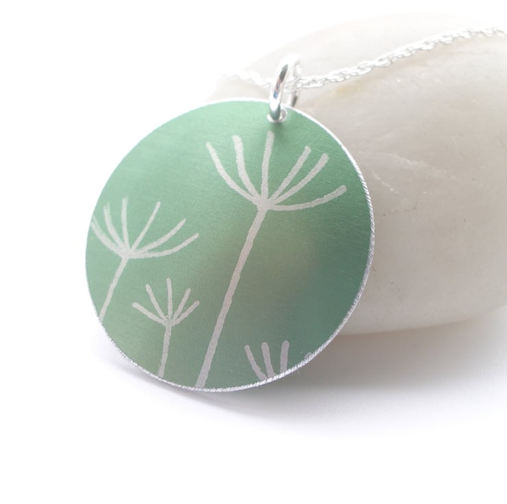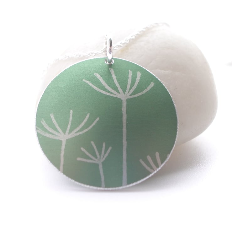This striking pendant is hand made from aluminium which I have dyed green and printed with a delicate dandelion seed design. I cut out the disc shape by hand and file the edges to reveal the bright silver aluminium underneath. Finally I dome the metal slightly so that it catches the light.