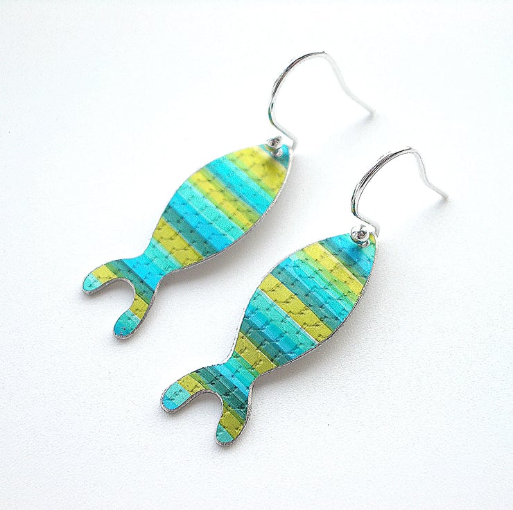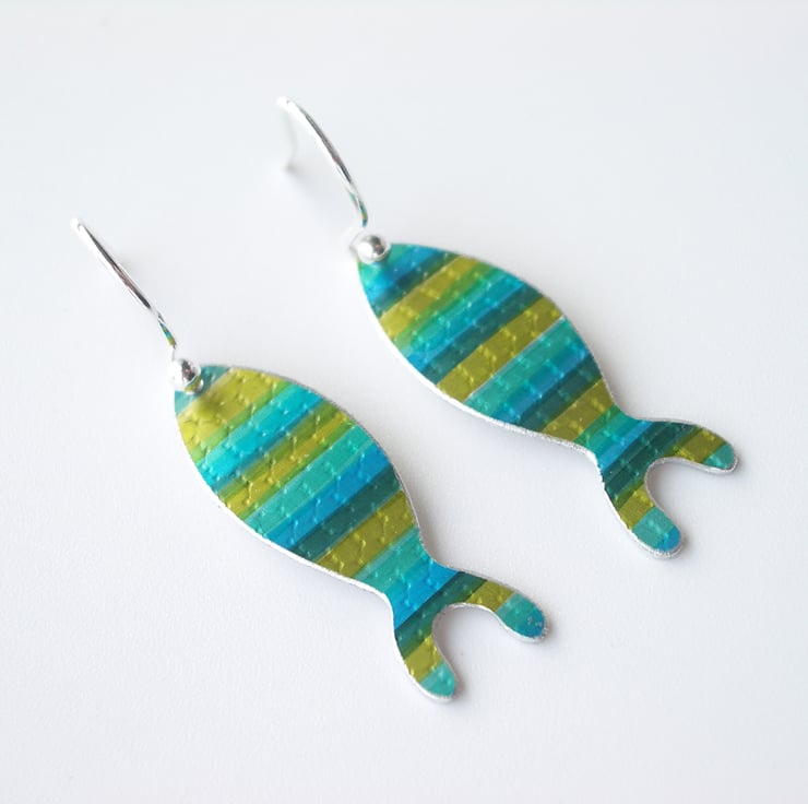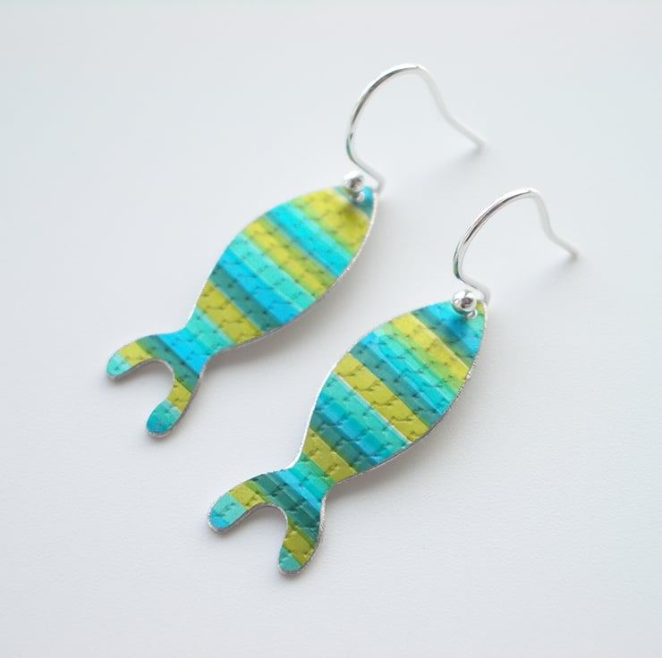 These rainbow fish shaped earrings are hand made from aluminium, which I have dyed in mixture of blue and green and sealed so that the dye becomes a permanent part of the metal. I have also added some texture to create fish scales. I then cut out the fish shapes by hand using a piercing saw. The metal has been domed slightly so that the colours catch the light.