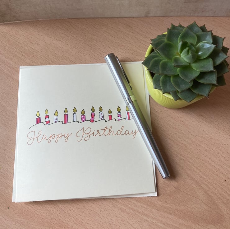 Made from 300 gsm cream coloured card, each card measures approx 13.5cm x 13.5cm and is supplied with a matching envelope. The candles have been drawn using a black glitter pen, before they have been hand painted with bright acrylic paint, the wording is printed in copper coloured glitter gel pen to add a subtle sparkle, the inside of each card is blank.
