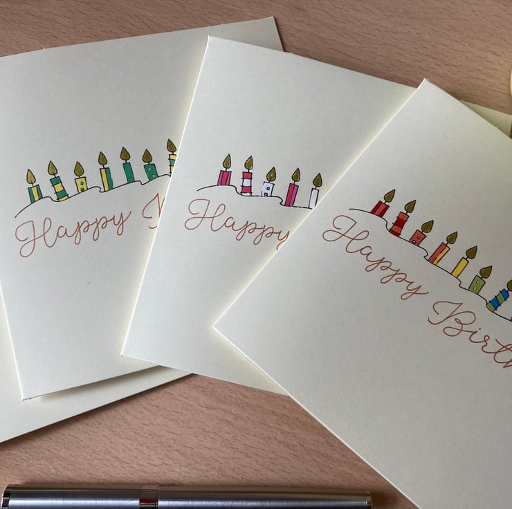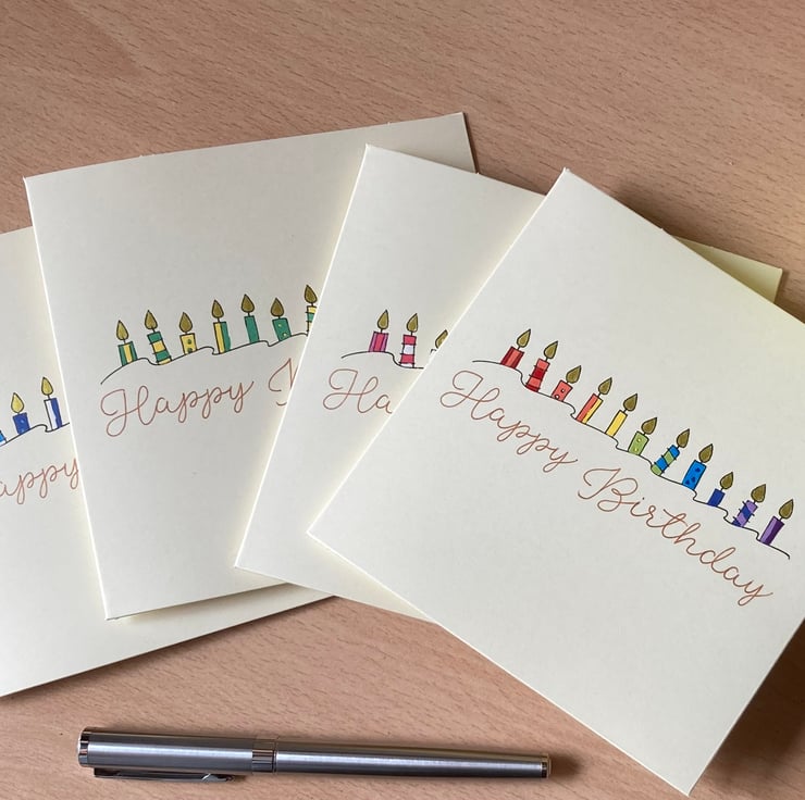 Cards to get you noticed, these lovely hand painted birthday cards feature 11 candles, above the wording Happy Birthday, each candle has been painted in shades of pink and white/ blue and white/ yellow and green or rainbow shades in acrylic paint, and finished with a gold acrylic paint flame.