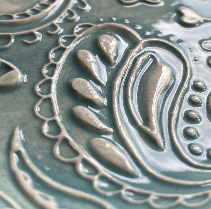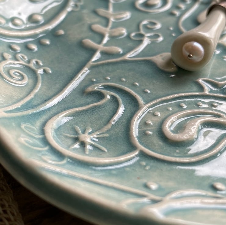This beautiful dish has been imprinted with an original MatildaBelle Paisley Carving, giving a wonderful raised design. Glazed in a soft Blue/Green and rubbed back to further reveal the unique pattern.