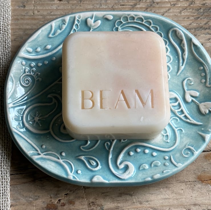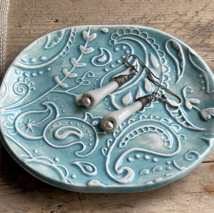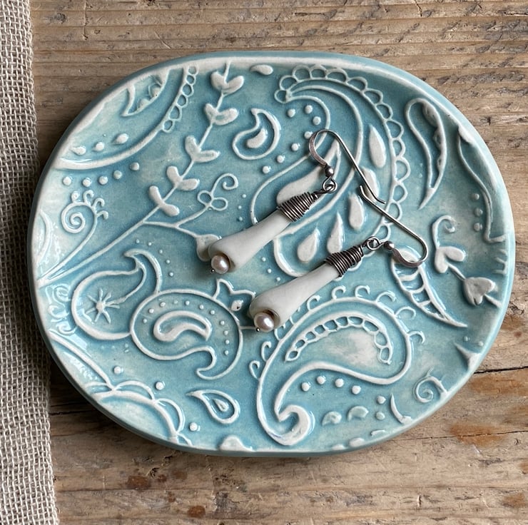 This beautiful dish has been imprinted with an original MatildaBelle Paisley Carving, giving a wonderful raised design. Glazed in a soft Blue/Green and rubbed back to further reveal the unique pattern.