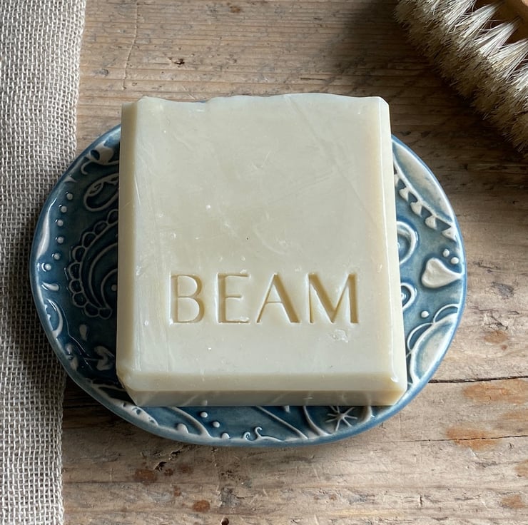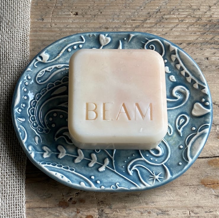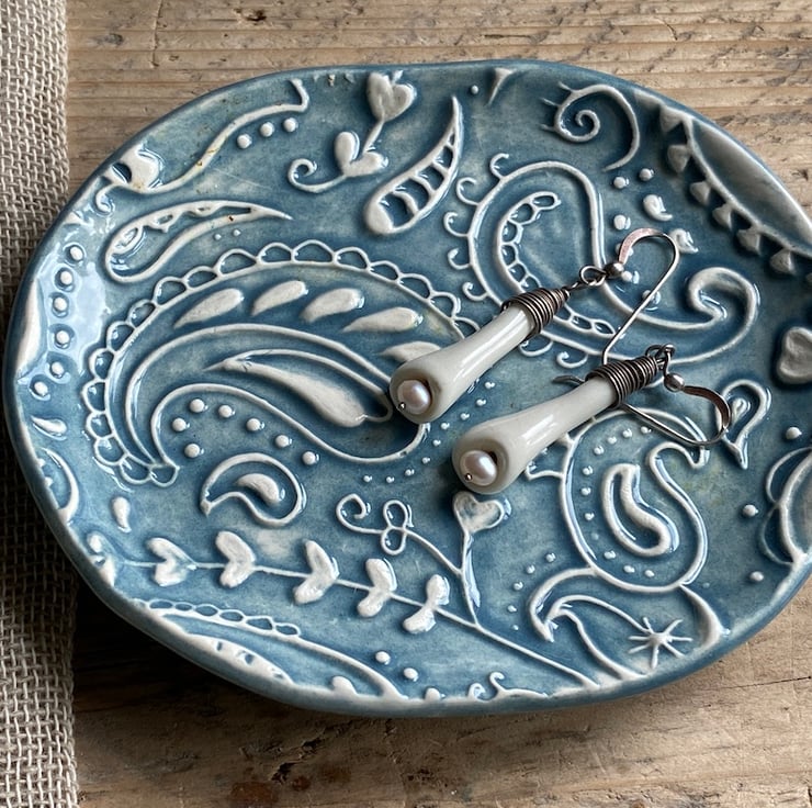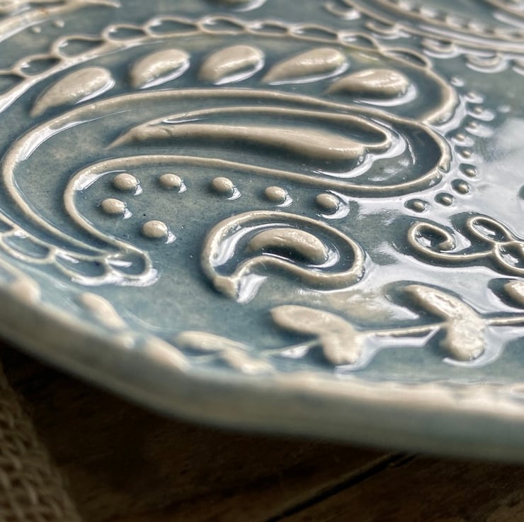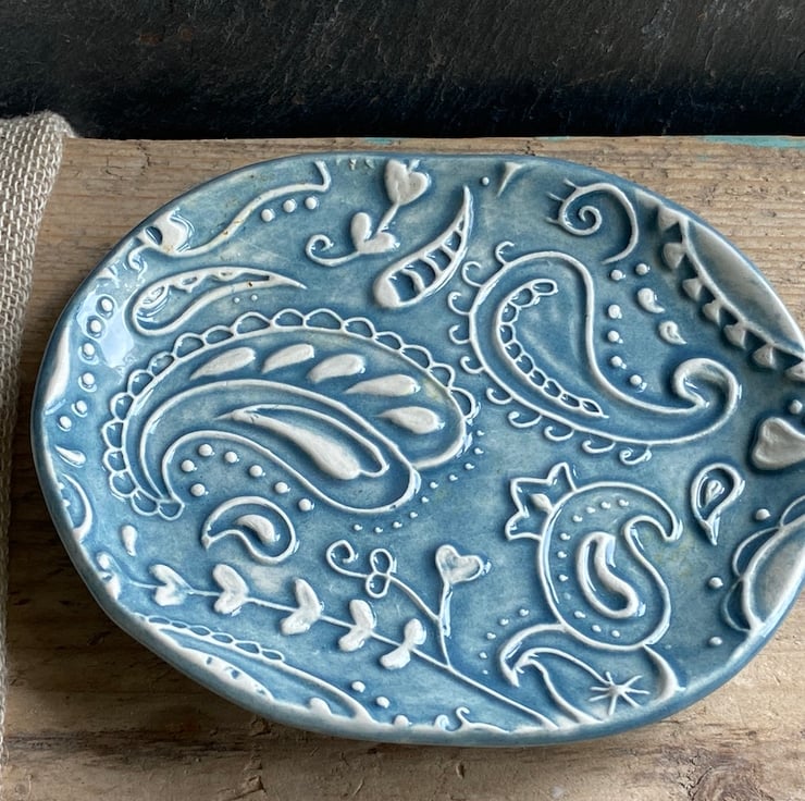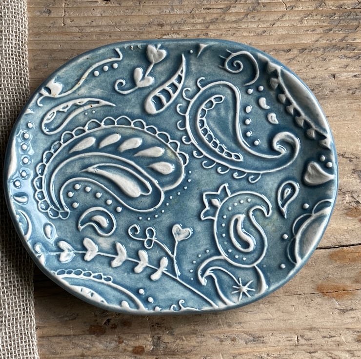 This beautiful dish has been imprinted with an original MatildaBelle Paisley Carving, giving a wonderful raised design. Glazed in a soft petrol Blue and rubbed back to further reveal the unique pattern.