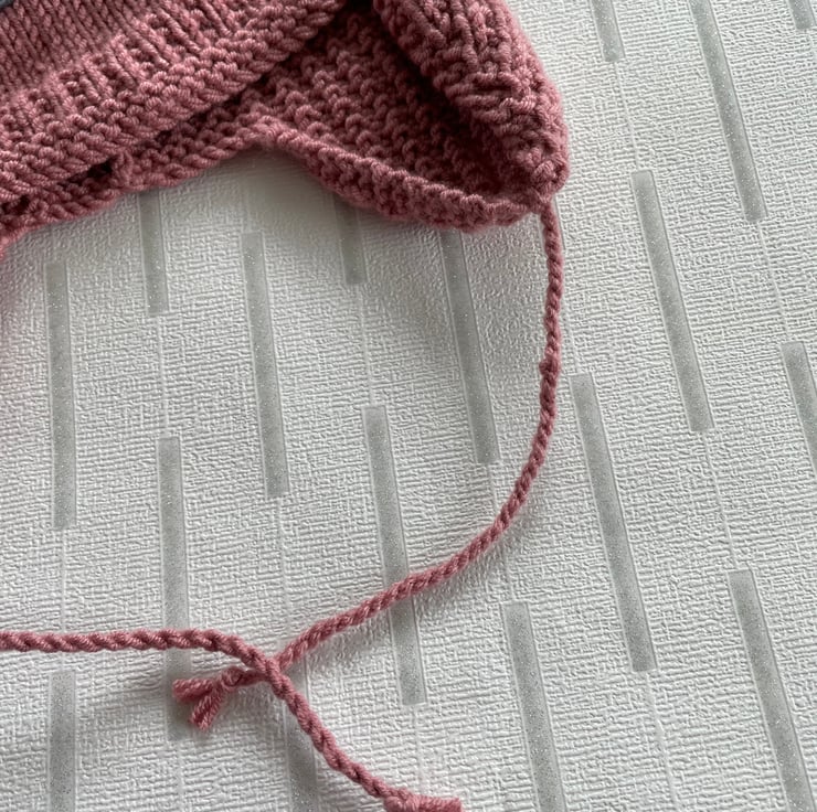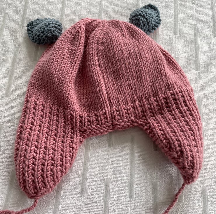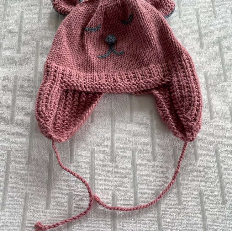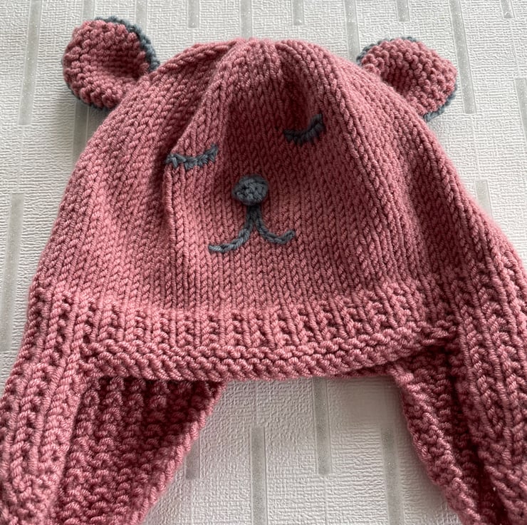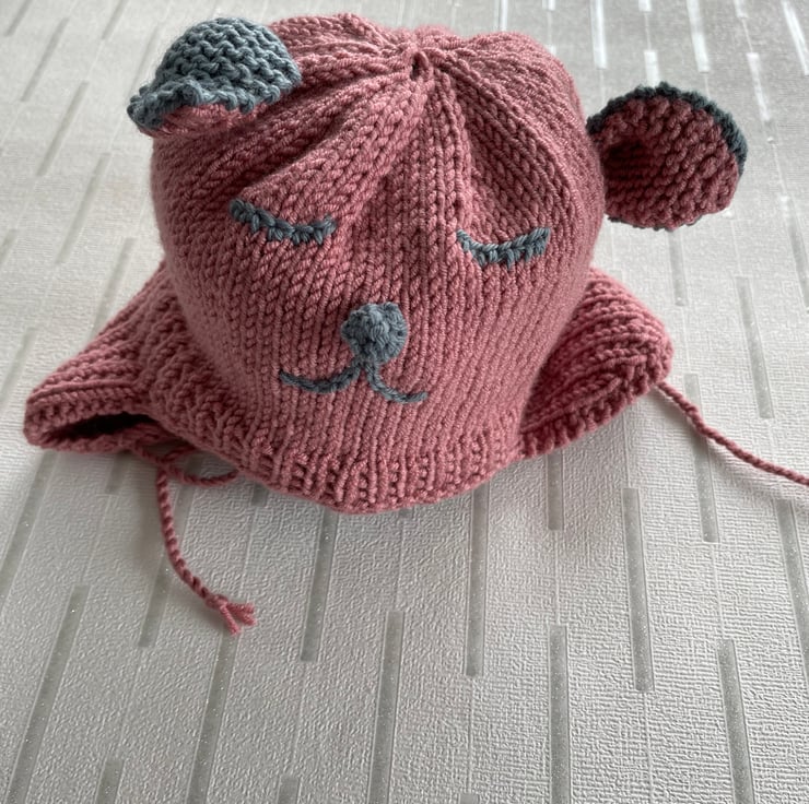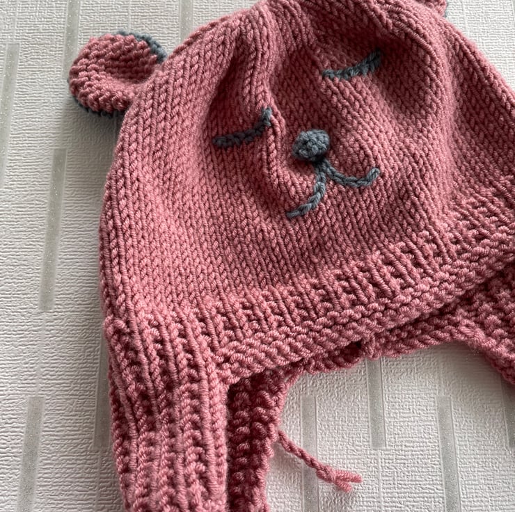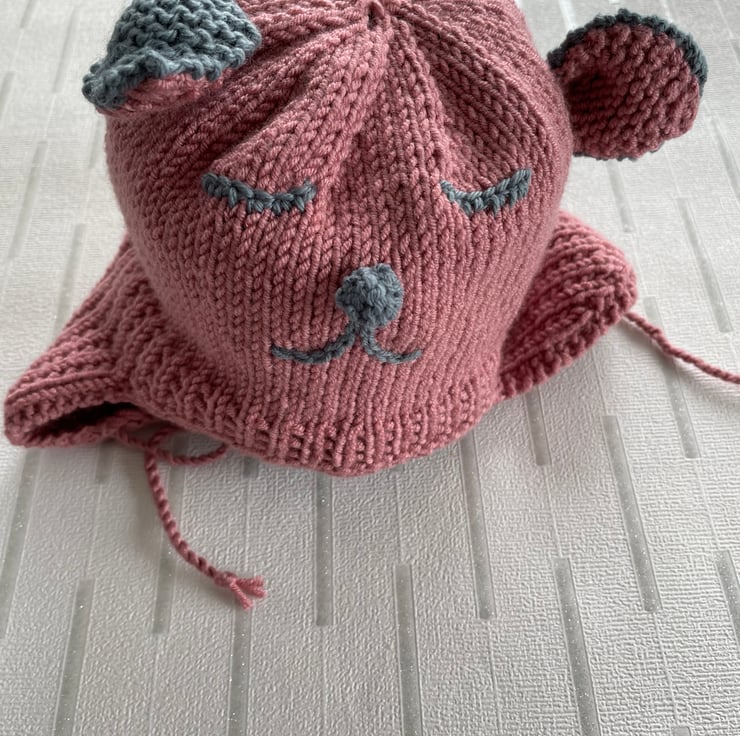 A hat with ear flaps hand knitted in a soft, deep pink baby yarn. The ear flaps and band are worked in a fancy rib pattern and the rest in stocking stitch. Bear ears in grey with pink inners are attached at the top and a grey face has been embroidered on along with with a knitted nose. Dangling strings are attached to the bottom of the flaps.
