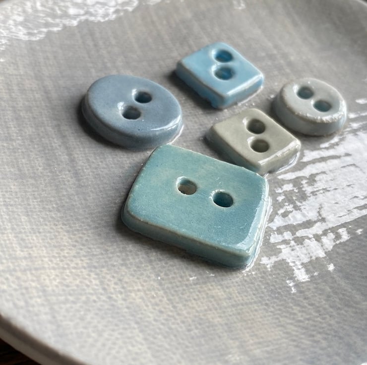 Glazed in a simple grey with varying shades of blue decorating the buttons.