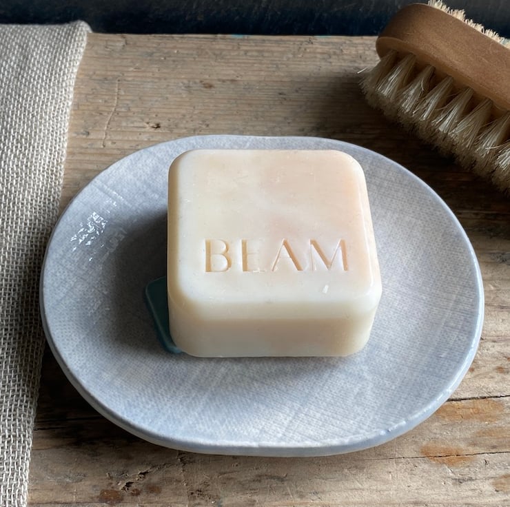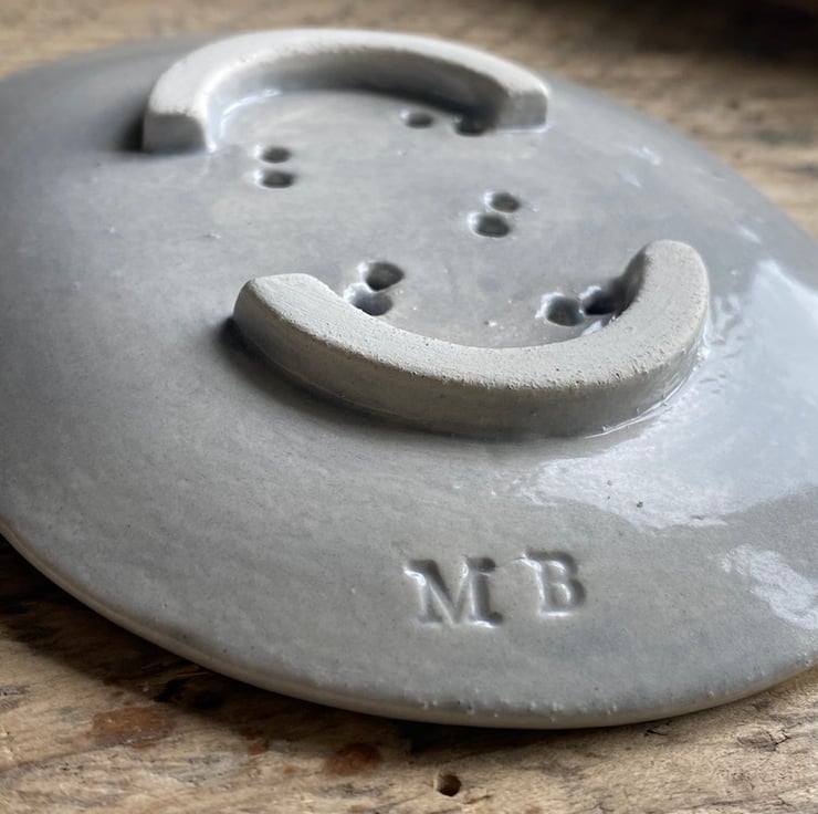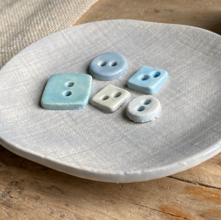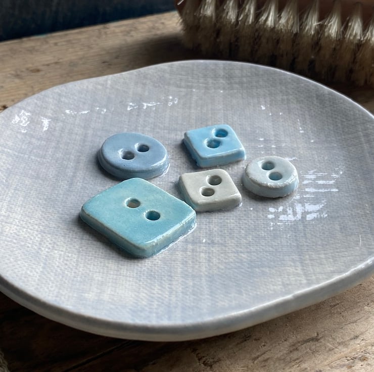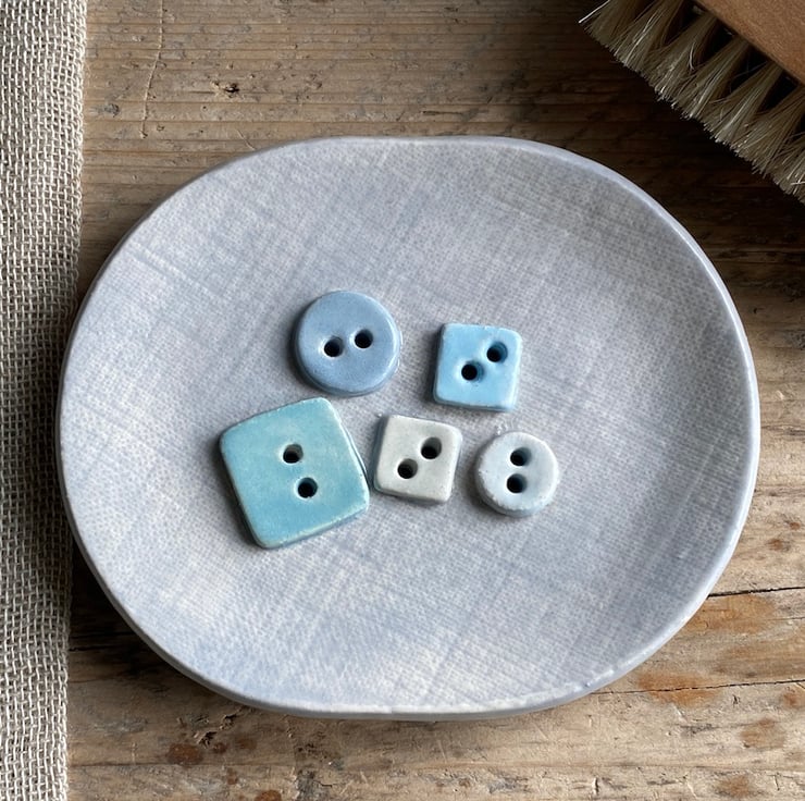 The dish has been imprinted to look like Linen with 5 buttons of different shapes and colours as decoration. The buttons are not just pretty but are wonderful for helping to keep the soap out of any water along with the button holes helping with drainage.
