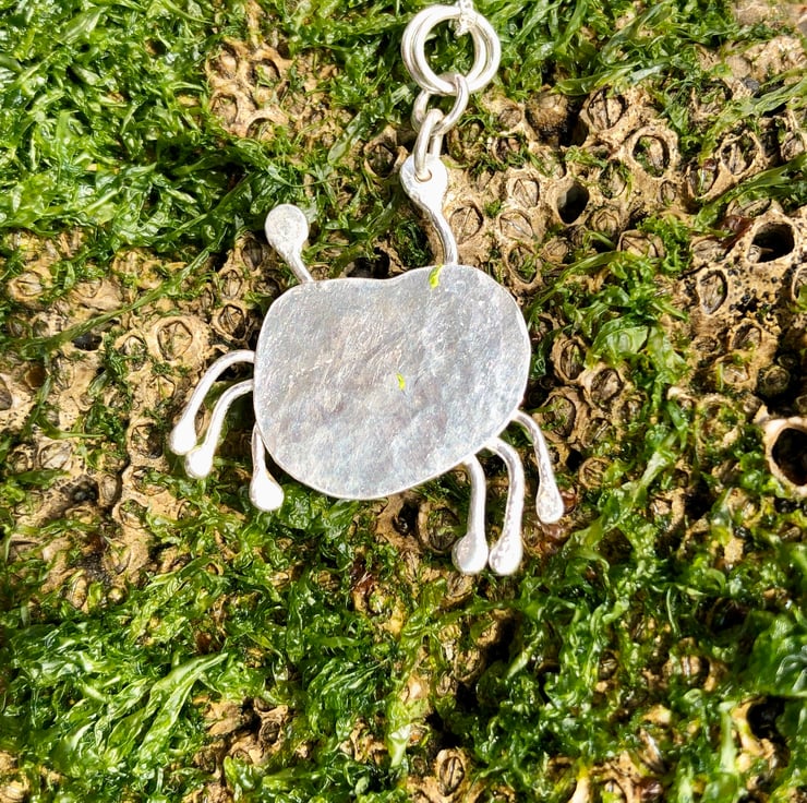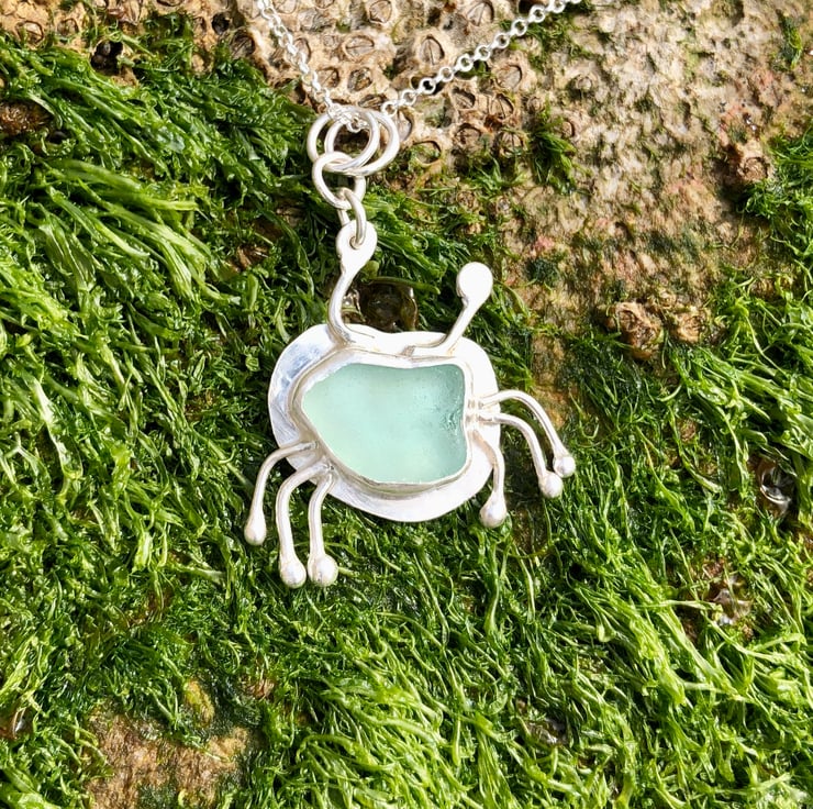This beautiful piece of aqua blue sea glass was found along the UK's South West coastline and has been set in a fine silver bezel (.999) and using recycled (ecosilver) sterling silver wire (.925) to create a beautifully unique crab pendant. The back of the pendant has been hammered giving a subtle textured appearance. This piece has not been hallmarked.