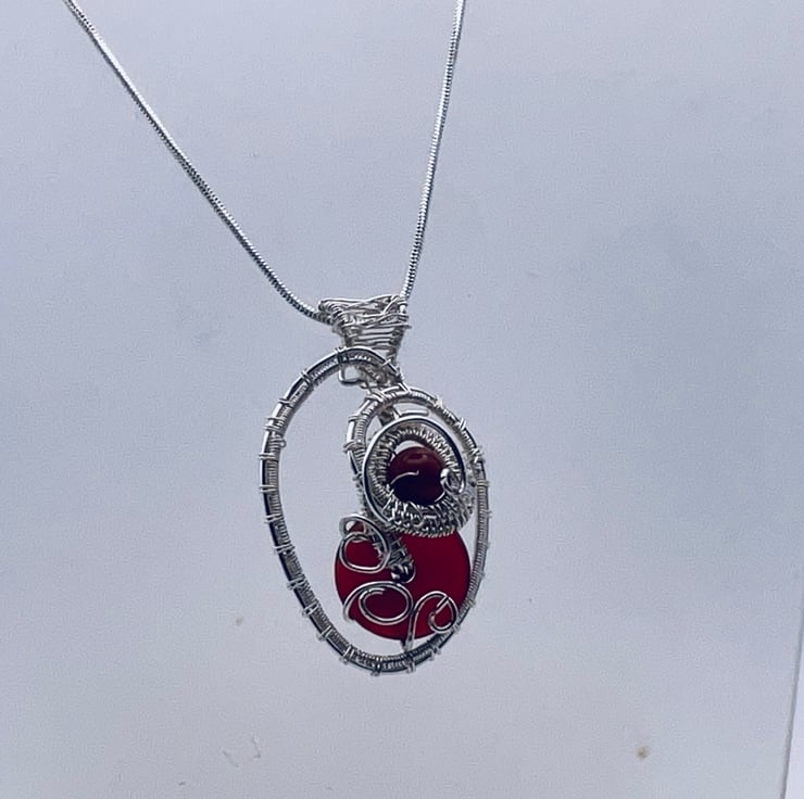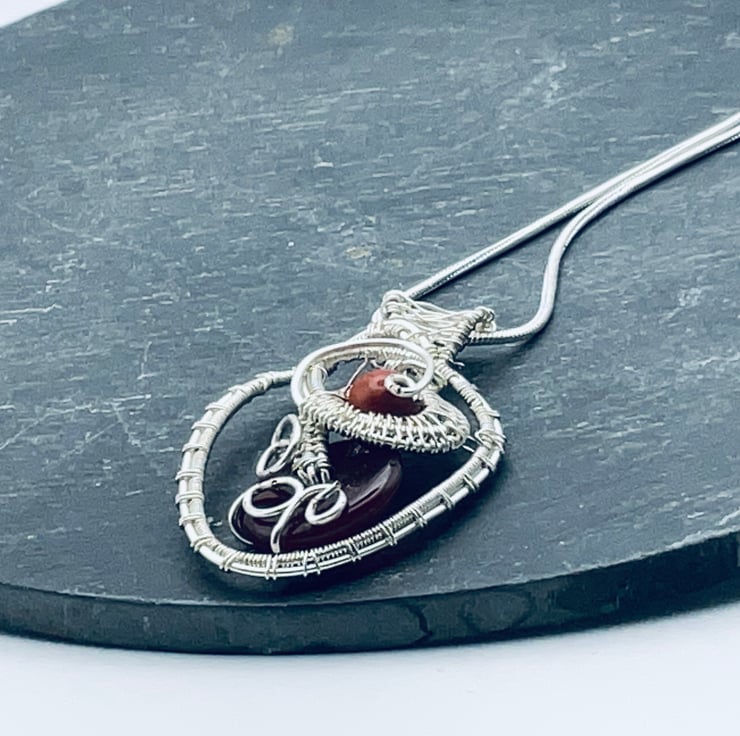 A carnelian mini disk is superimposed by a Jasper bead and surrounded by a silver oval ark and scrolls.