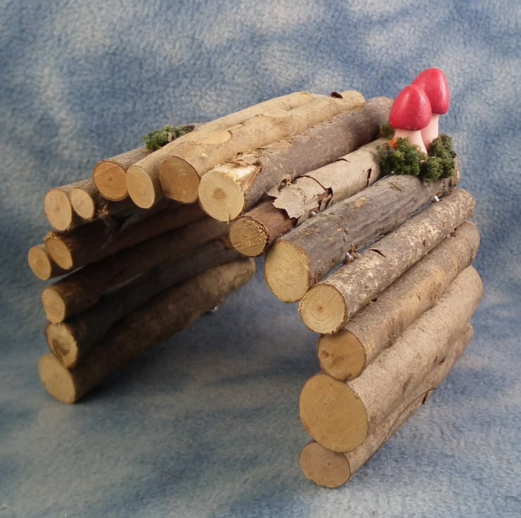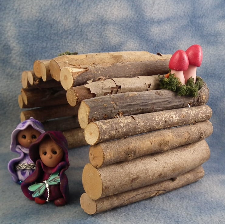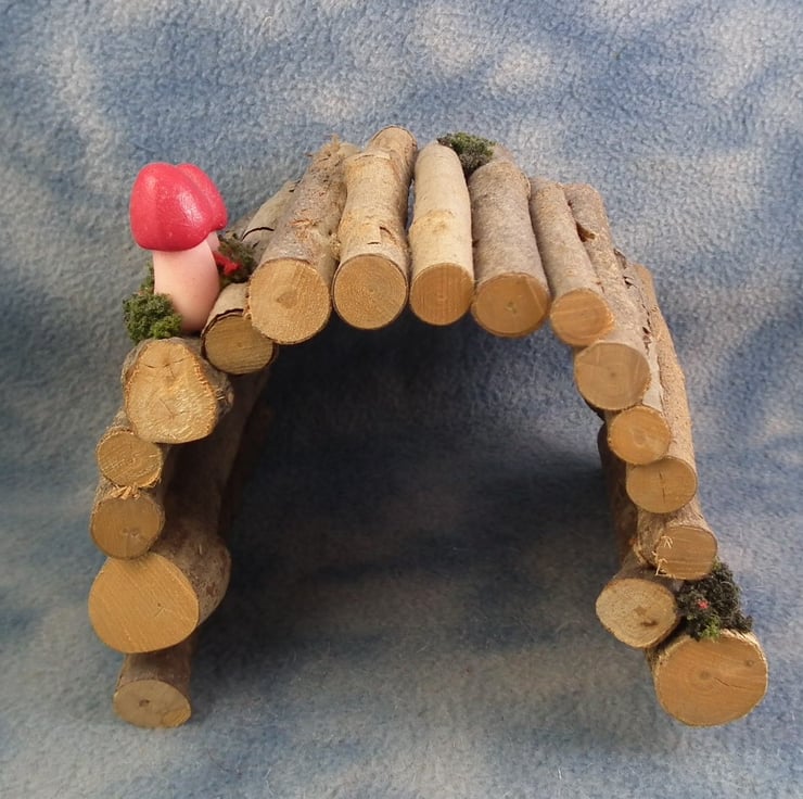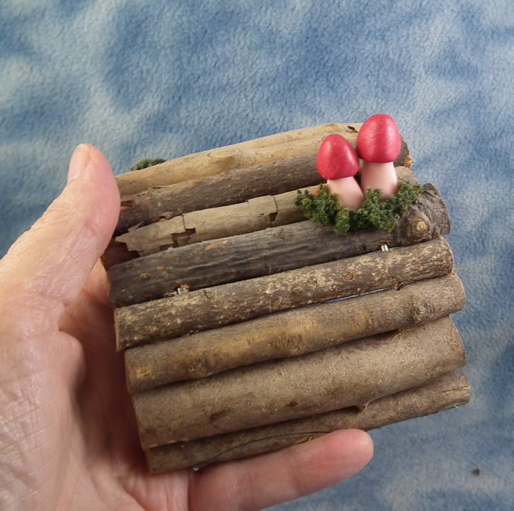Spring Sale ... A wooden gnome-shelter with toadstools and moss ... three and a half inches high. Gnomes listed separately.