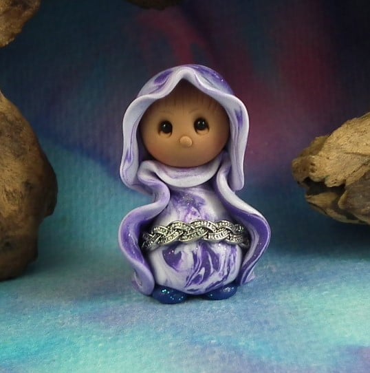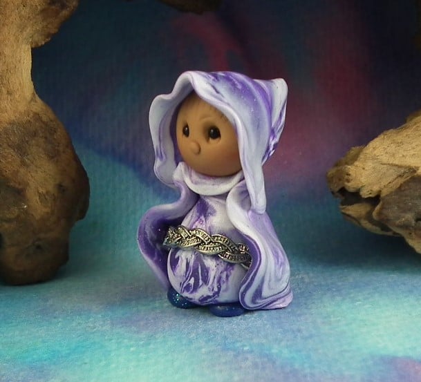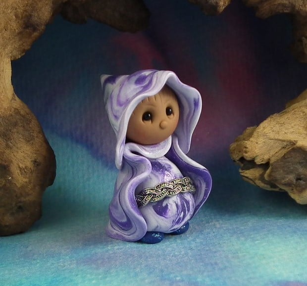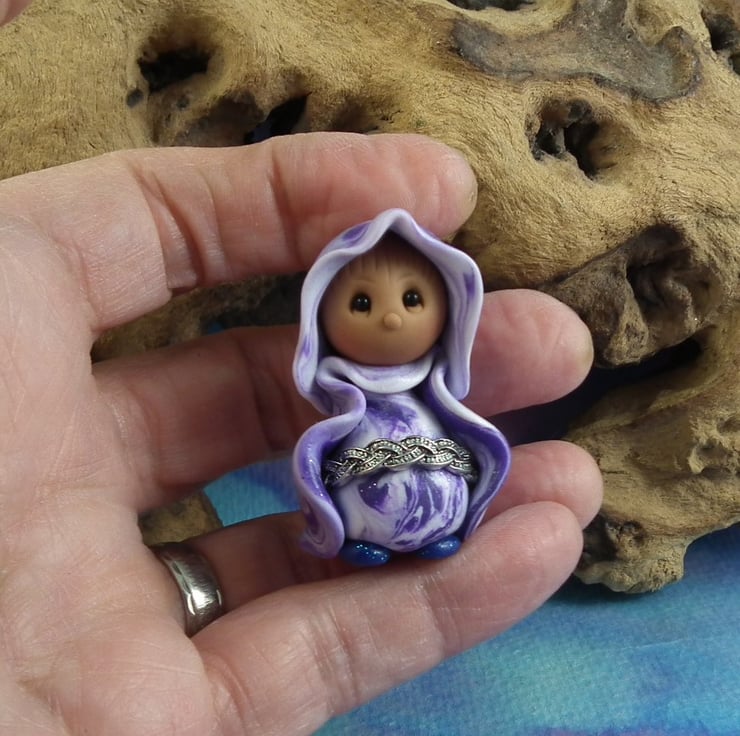 This is a 'one of a kind' creation having been entirely handmade without the use of moulds here at my studio on the Sussex Coast. Modelled with artist blend polymers, blushed before sealing with lacquer, Wanda has sparkling black onyx eyes and purple robes. Wanda the Magical Gnome is just one and a half inches tall.