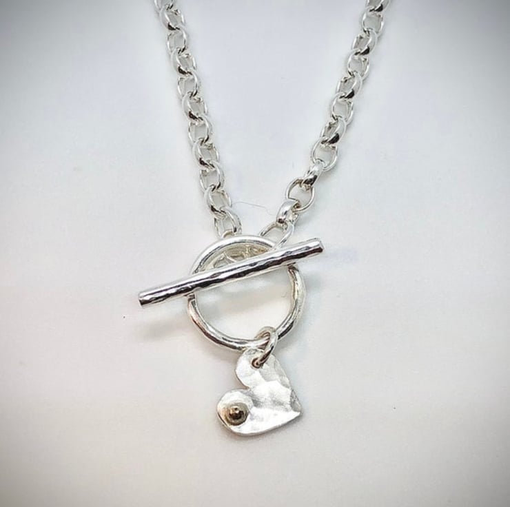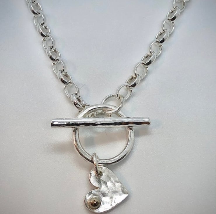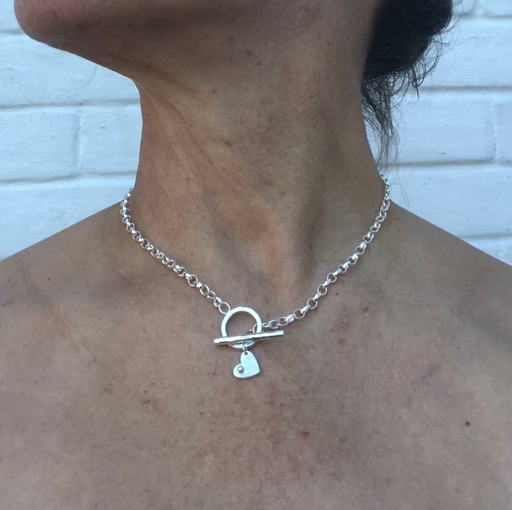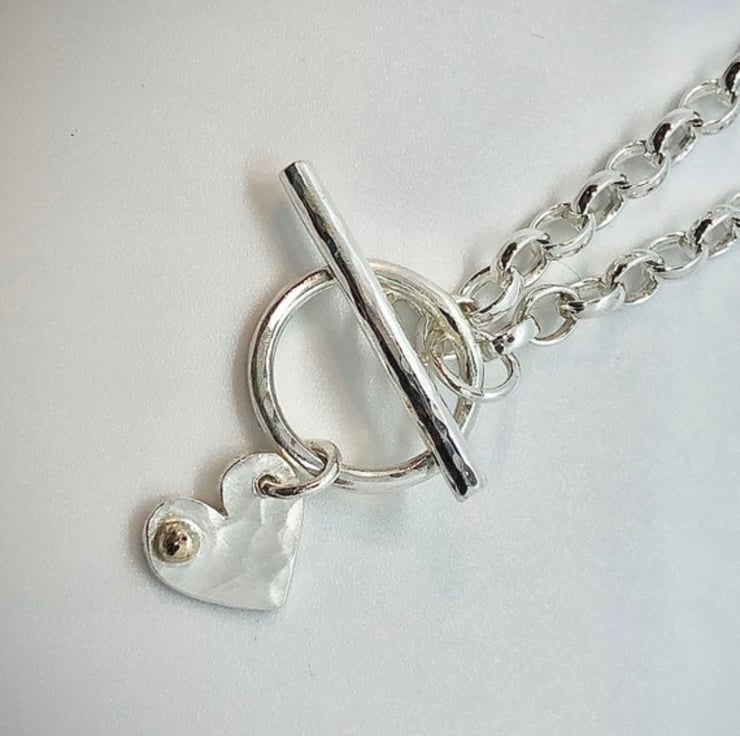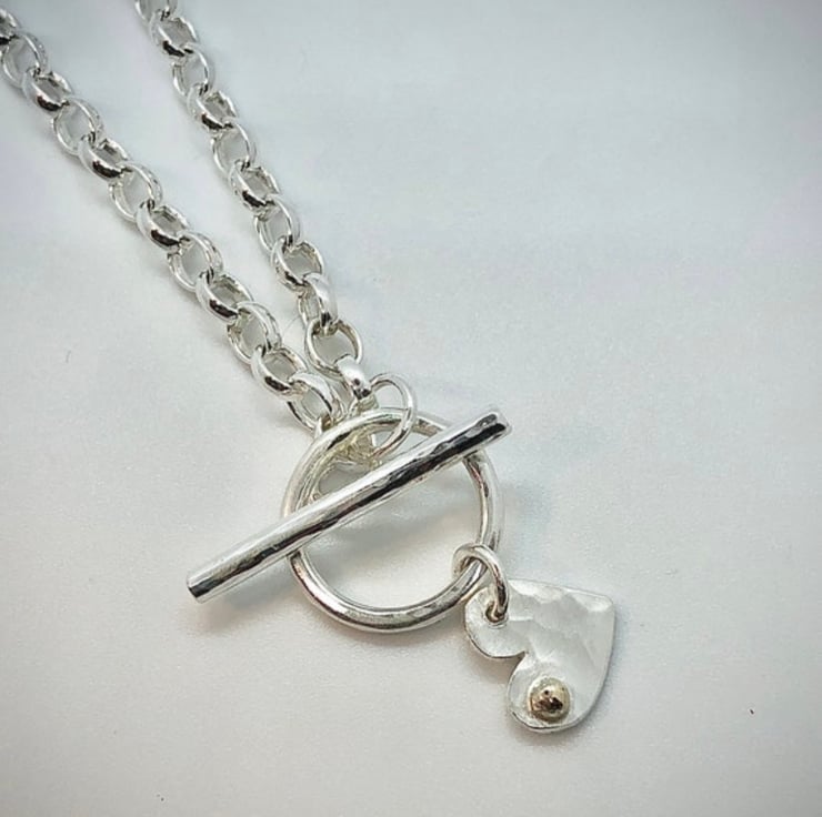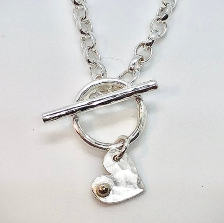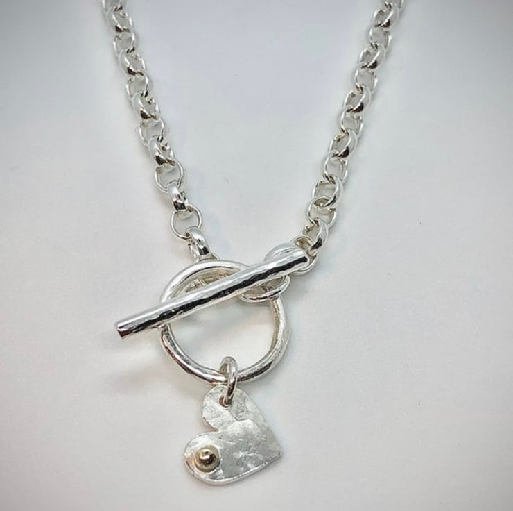 This Sterling silver fob necklace was inspired by the old Victorian Fob watches. This toggle necklace has a medium sized belcher link and features a tilted silver heart with 9ct gold detail off centre. I have hammer-textured the t-bar, ring and heart charm. The chain length is approx: 16” but if you require a different length, please leave a message for me in ‘Notes’ at Checkout.