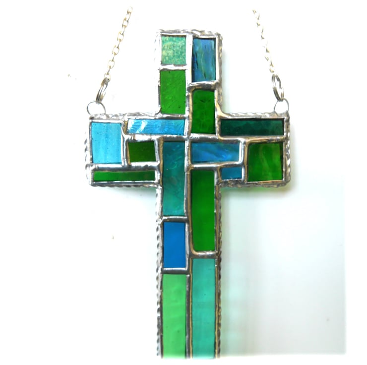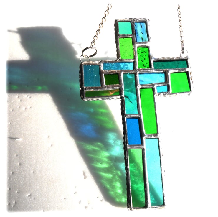 It is a simple cross shape but the patchwork arrangement of colours is classic stained glass design.