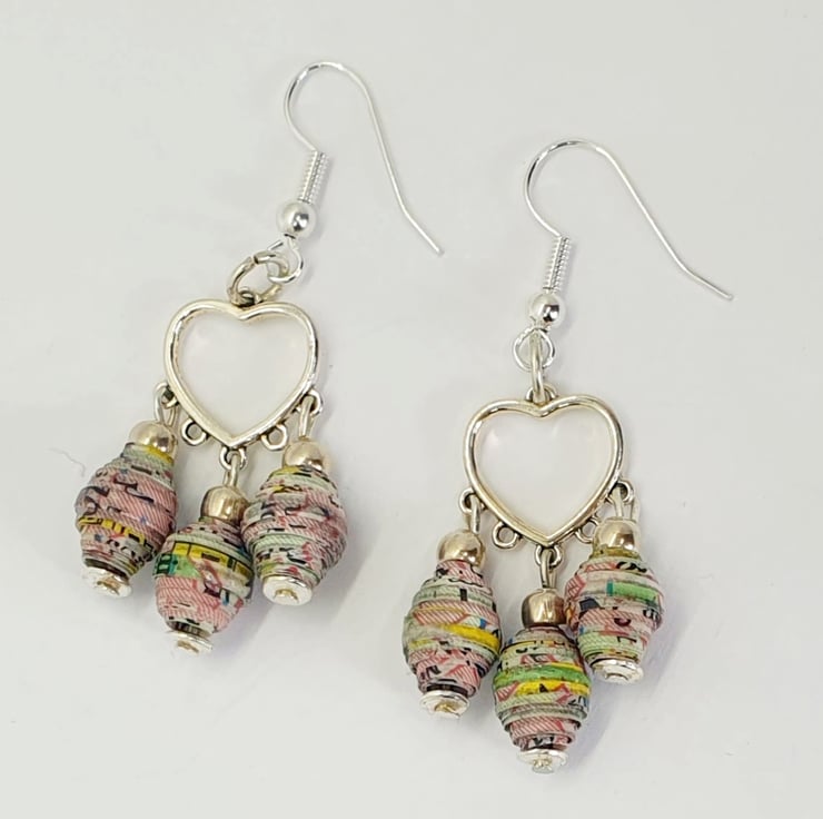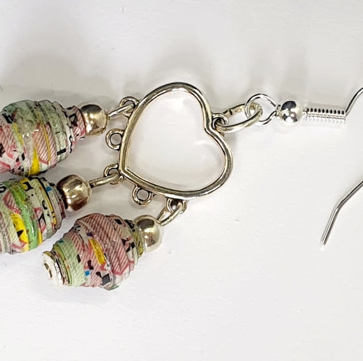 Cute little dangle earrings made with handrolled paper beads dangling from heart shaped earring findings