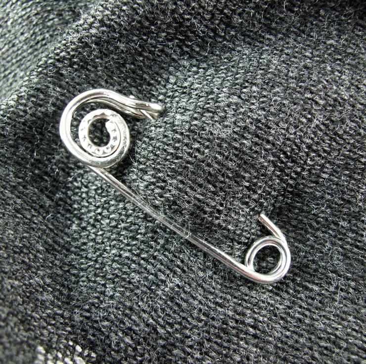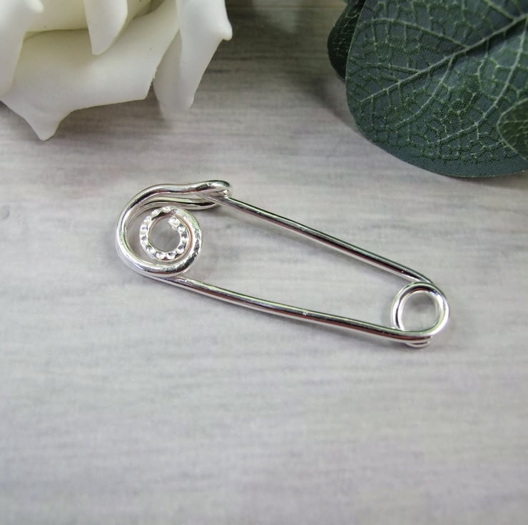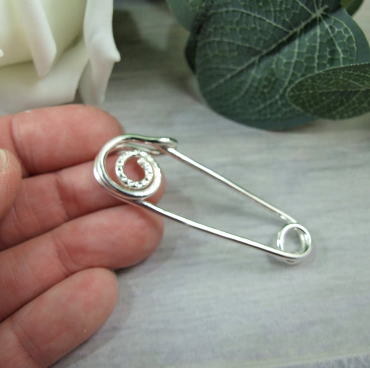 I have created the pin from 2mm recycled sterling silver wire entirely shaped by hand. At one end I have looped around to form the hook and scroll and the other has a blunt point.