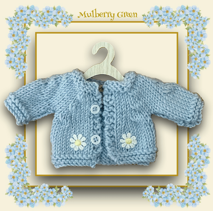 A sweet little pale blue cardigan, trimmed with daisies, to fit the Mulberry Green characters. The cardigan is hand knitted and looks lovely with the dresses in my shop.
