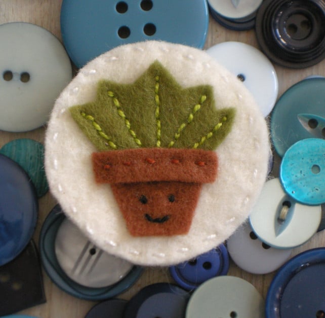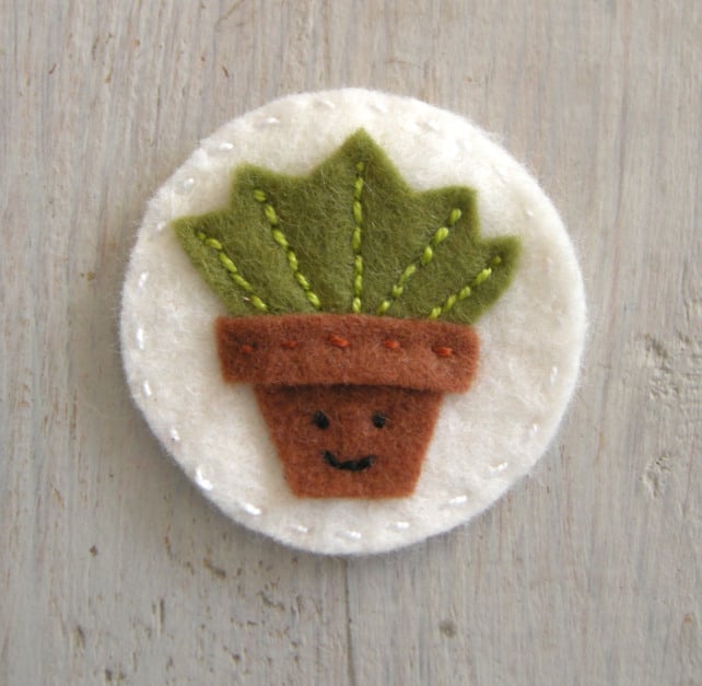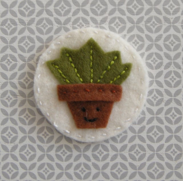 A cute plant brooch which has been designed and hand cut from good quality felt. The brooch is then hand sewn with embroidery thread and finished off with a cute little face. The brooch is attached to a printed original drawing.