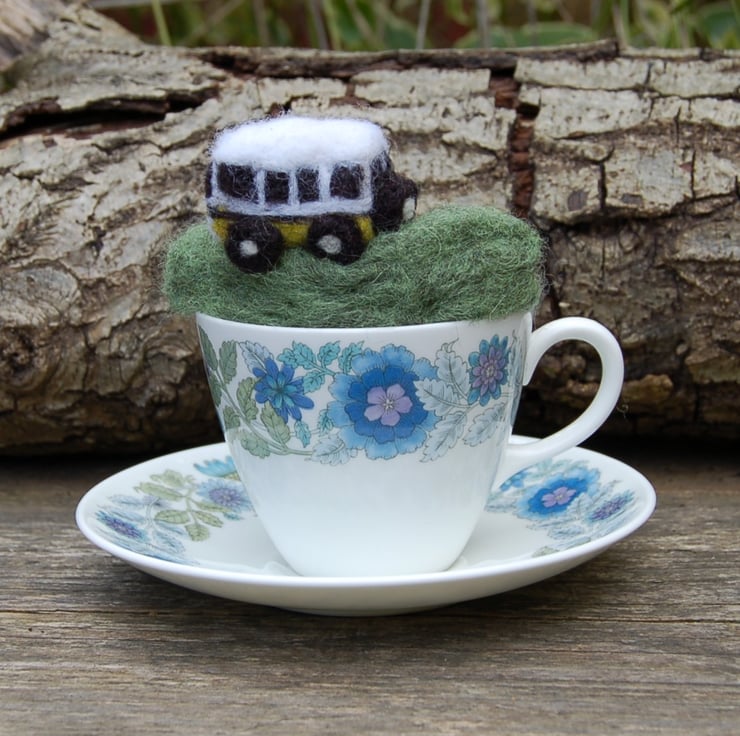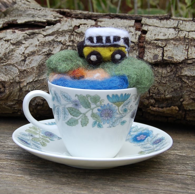 The scene is made from wool fibres needle felted into shape. The beach, sea and fire are also wool fibres. I've placed the scene into a vintage Wedgewood Clementine pattern tea china cup and saucer. The cup and saucer are in very good condition although not to be used as the scene in glued into the cup.