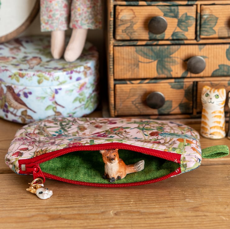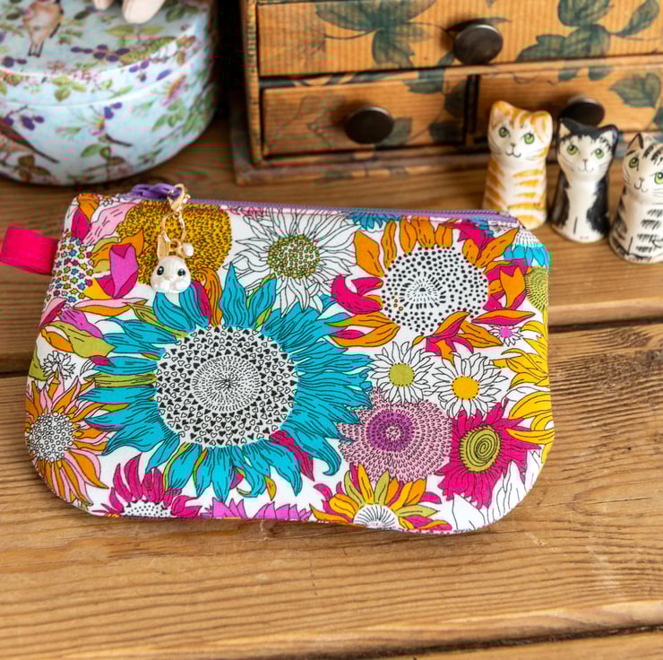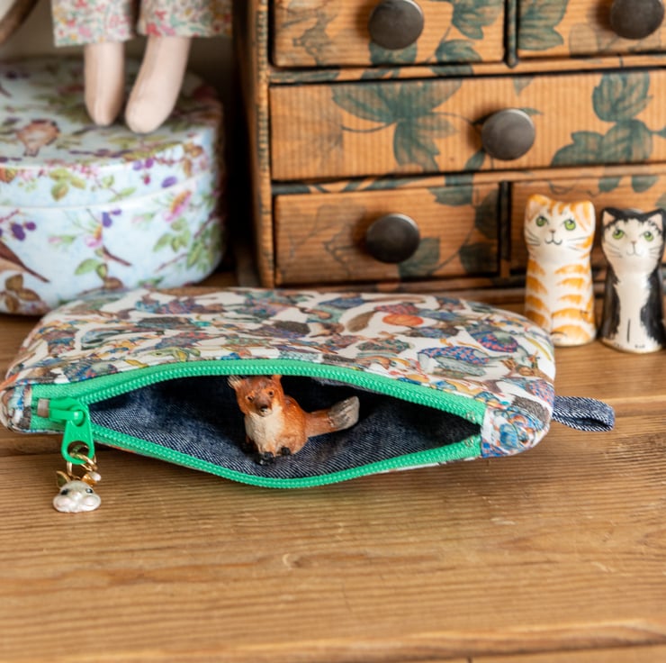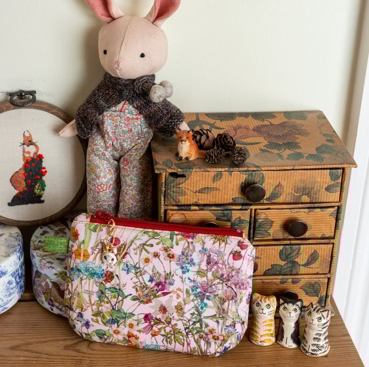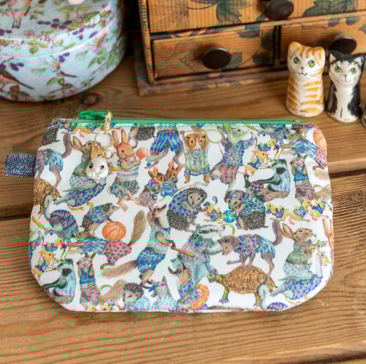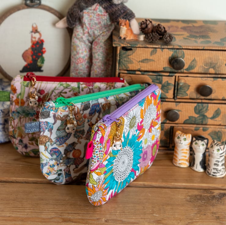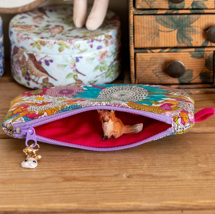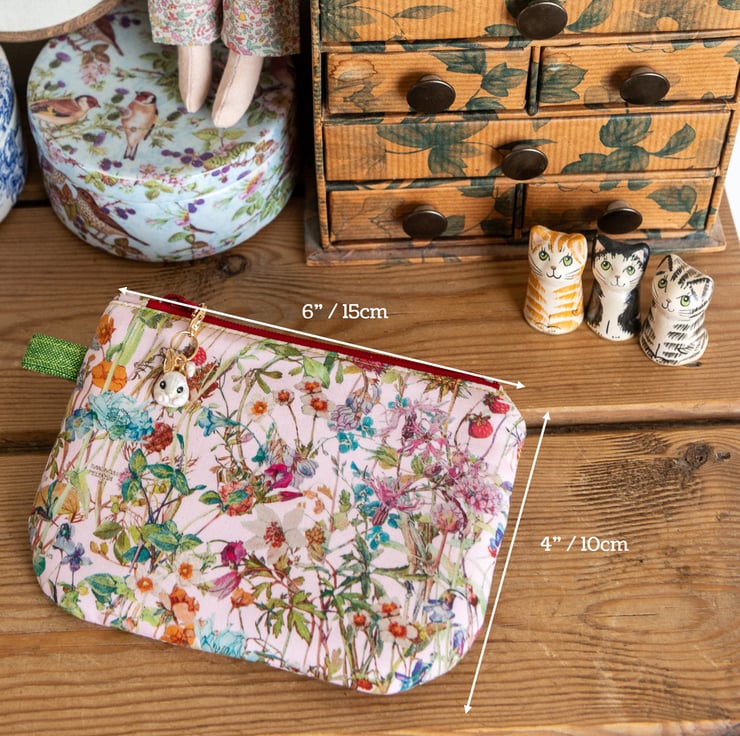 The shape of this purse is a simple little rectangle with nicely curved corners and the quality YKK zip is topstitched. The linings of these purses are Essex Linens. The purses also come with a little bunny charm you see attached to the zip in the pictures, which you can also detach and use as progress keeper if you knit or crochet.