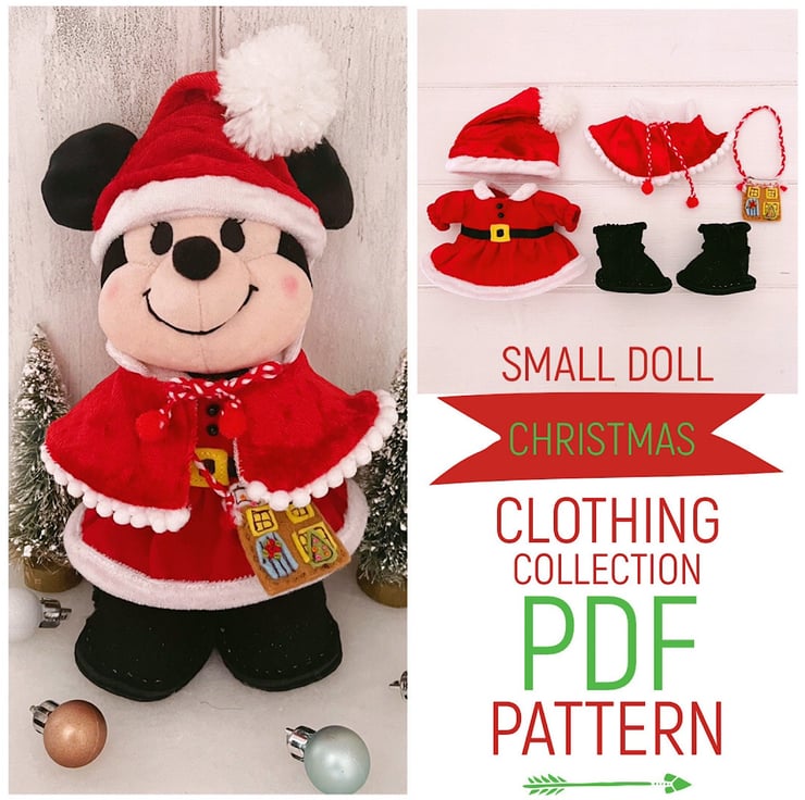 Digital PDF sewing pattern & photo tutorial to make these dress up mini doll Christmas Holidays clothing & accessories designed to fit small dolls approximately 18cm (7 inches) tall such as Disney Nuimos.