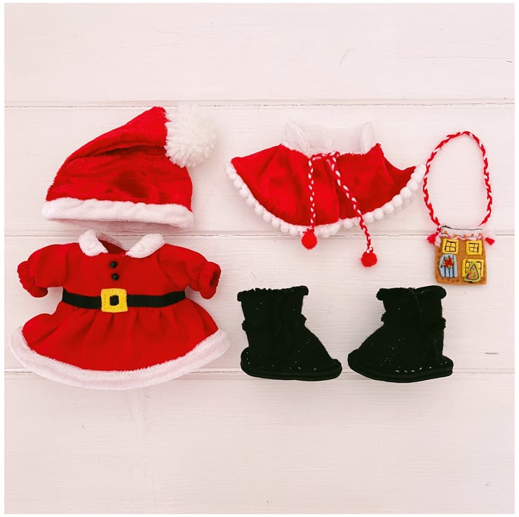 Items of clothing & accessories featured in this pattern include: A Santa Claus inspired dress featuring a ribbon belt & a cosy crushed velvet collar & hem. A Santa hat complete with pompom which can be made in two sizes depending on the size of your Nuimo’s head & with the addition of ear holes if necessary. A pair of Ugg style boots featuring fluffy yarn trims on the seams. A Santa Claus inspired cape with mini pompom trimming & an adorable little Gingerbread house tote bag ready to fill with tiny presents.