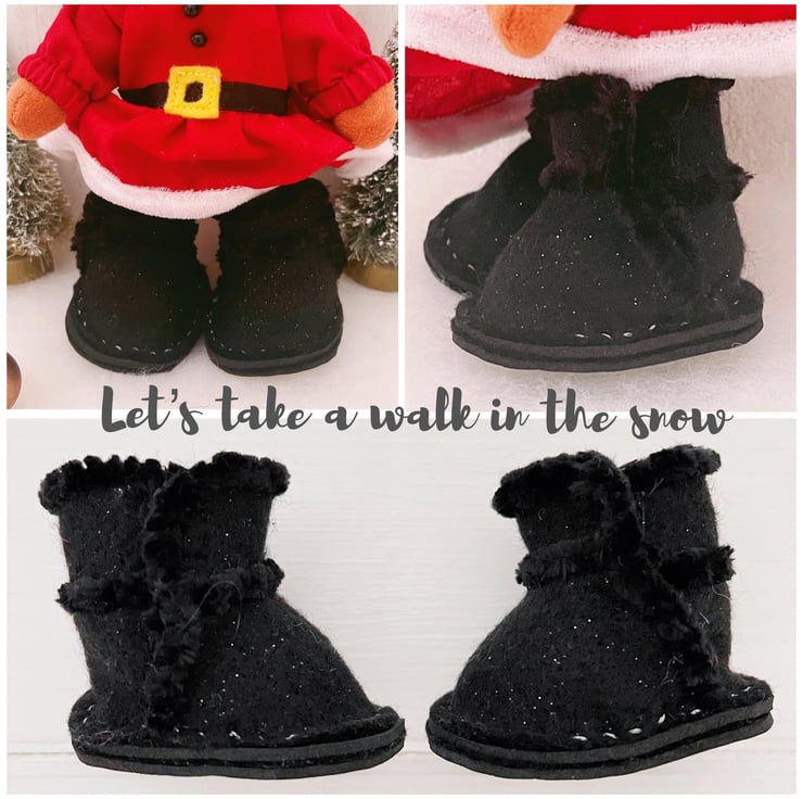 A pair of Ugg style boots featuring fluffy yarn trims on the seams. A Santa Claus inspired cape with mini pompom trimming & an adorable little Gingerbread house tote bag ready to fill with tiny presents.