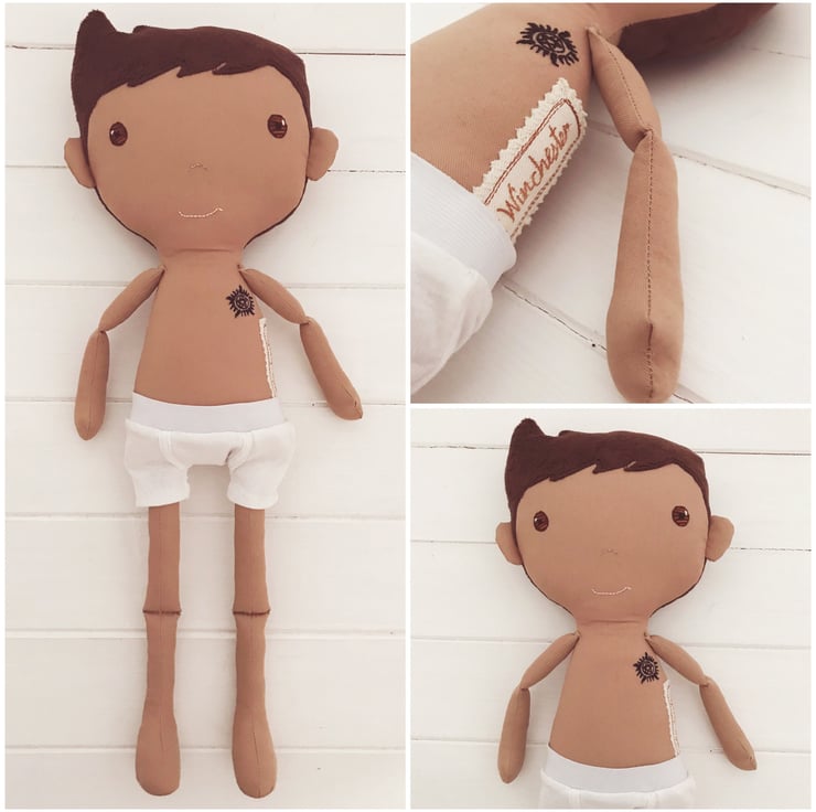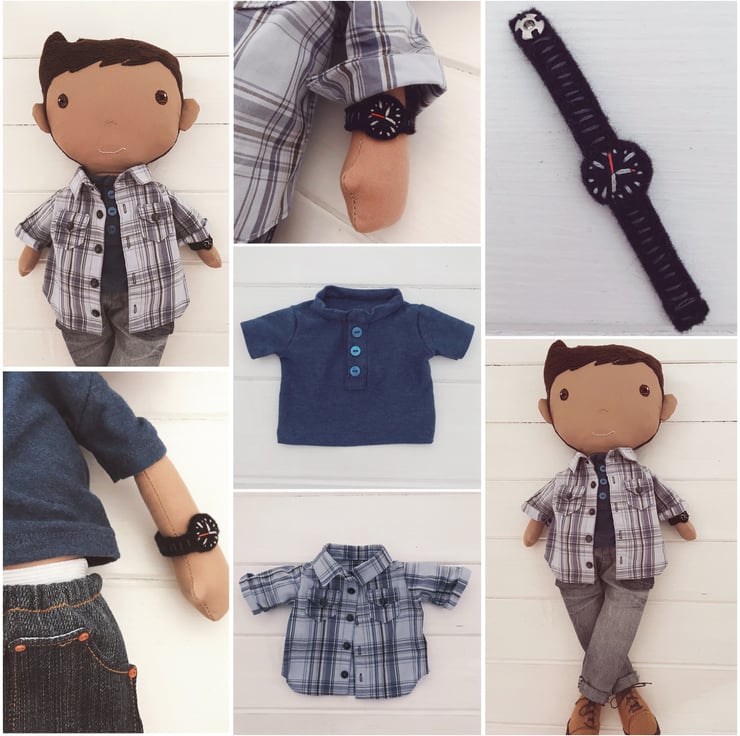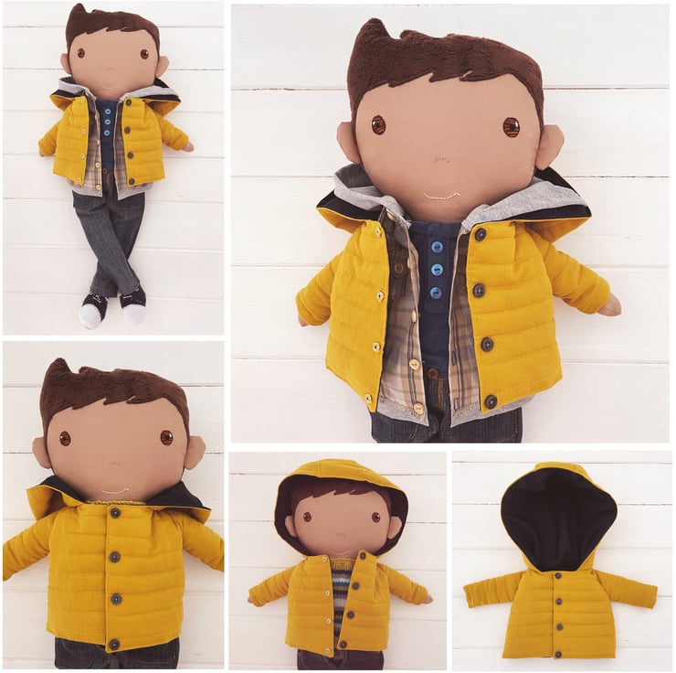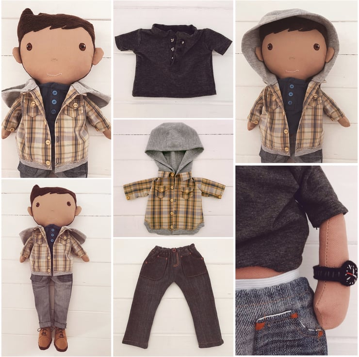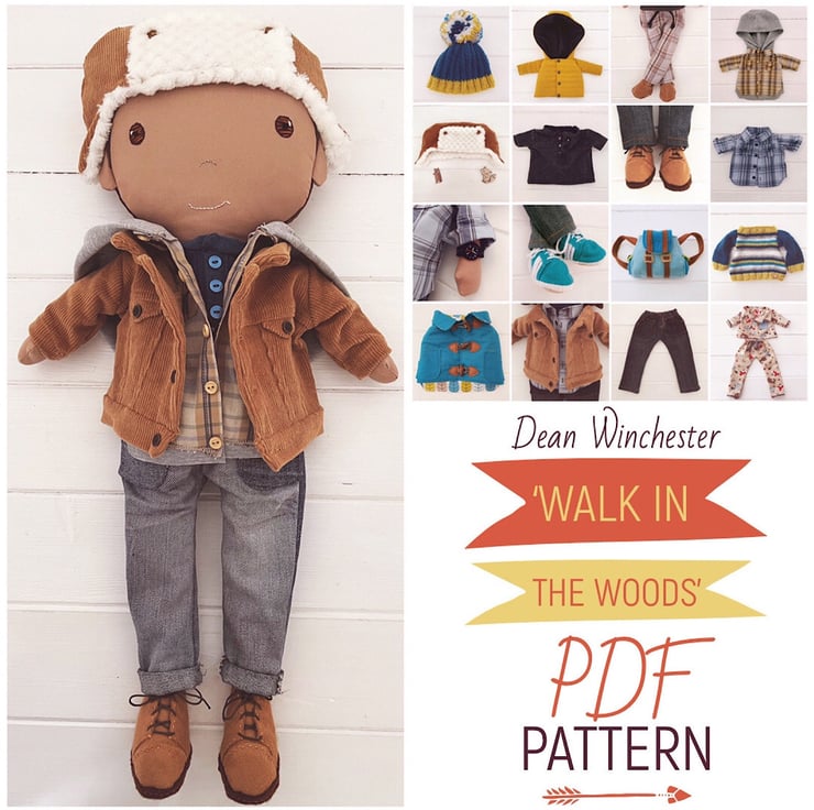 Digital PDF sewing pattern & photo tutorial to make this boy cloth doll featuring 'Dean Winchester' & our 'Walk in the Woods' Autumn & Winter boy doll clothing collection. Pattern includes doll & 19 items of clothing & accessories.
