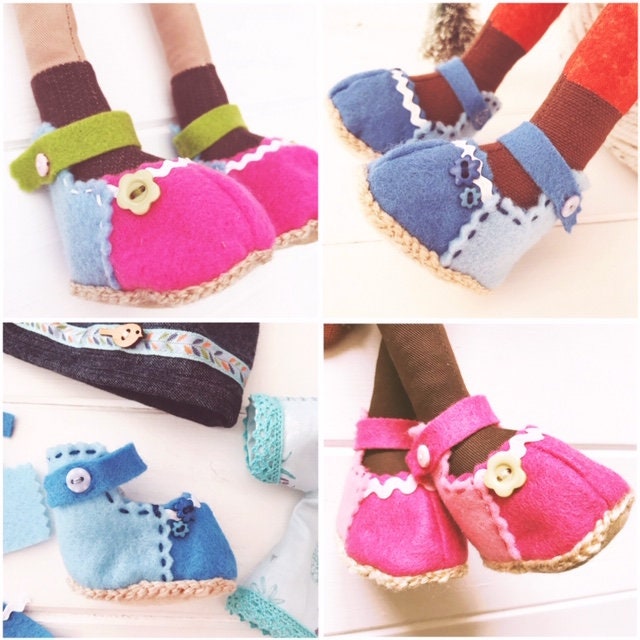 Depending on the fabric used the feet of these dolls are approximately 5cm long with a circumference of approximately 12cm. The shoes are designed to see your doll through all seasons & are constructed using a variety of fabrics including felt, cotton & yarn.