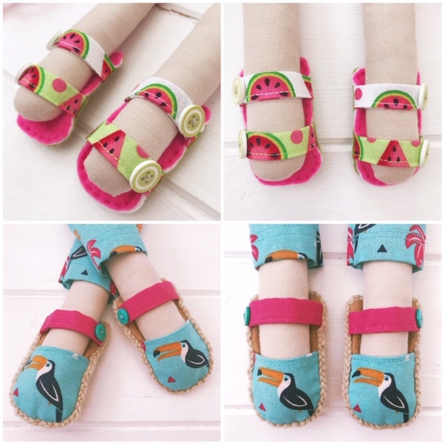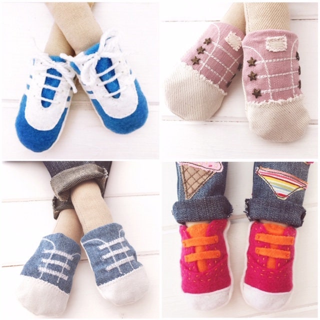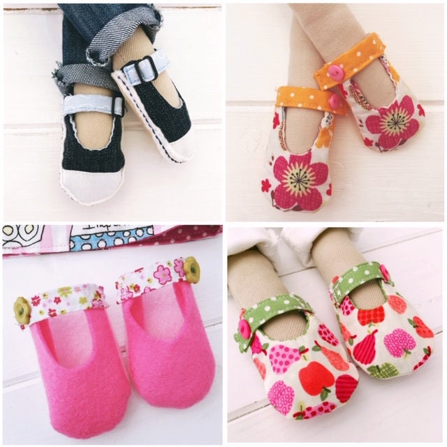 Digital PDF sewing pattern & photo tutorial for shoes designed for cloth dolls with straight legs. Pattern includes 11 items of customisable footwear.