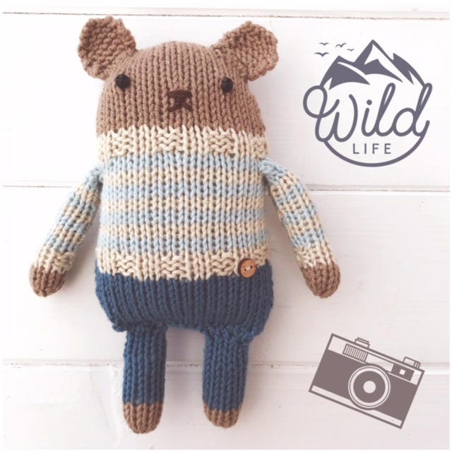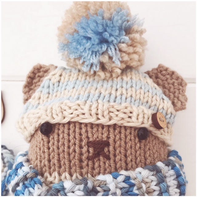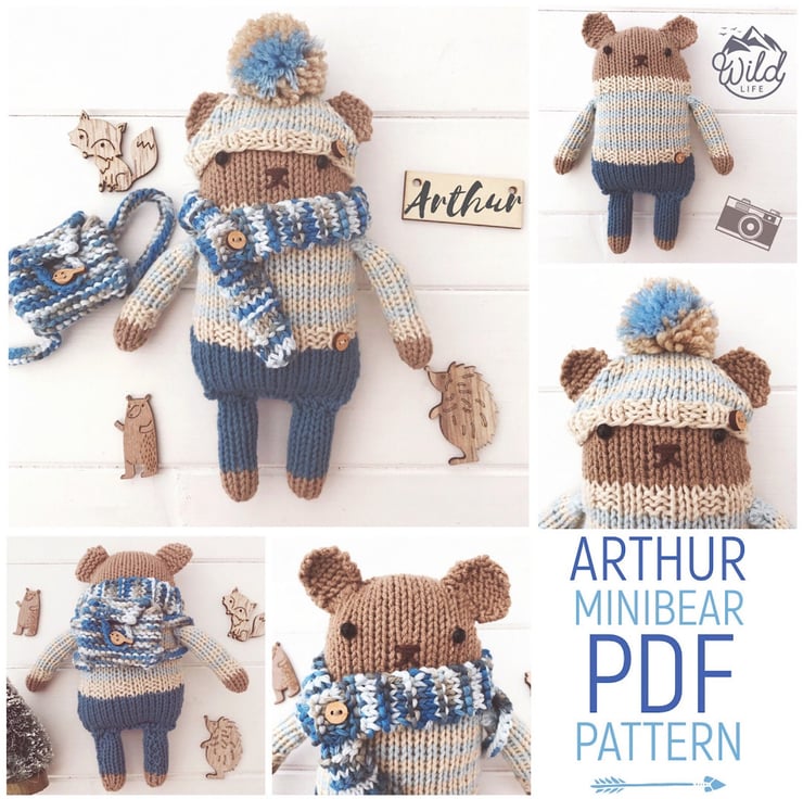 Learn to knit your own easy-knit 'Arthur' bear toy & his cosy accessories with this full colour PDF pattern & detailed tutorial.
