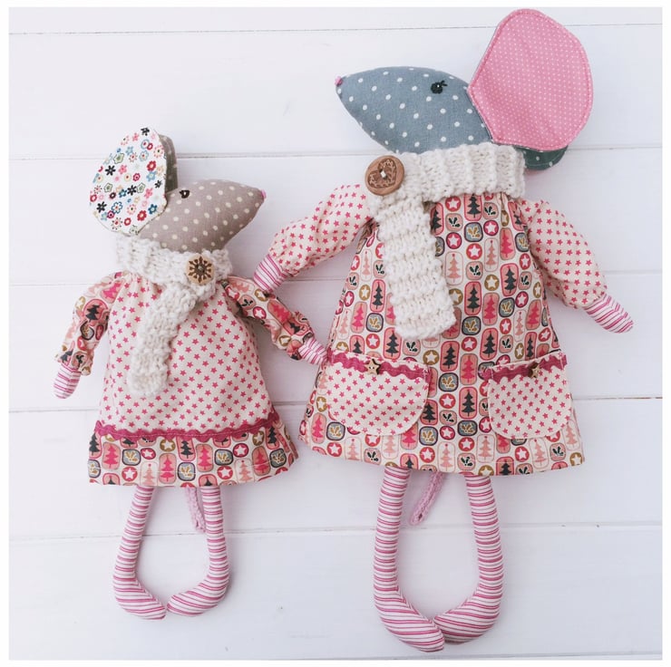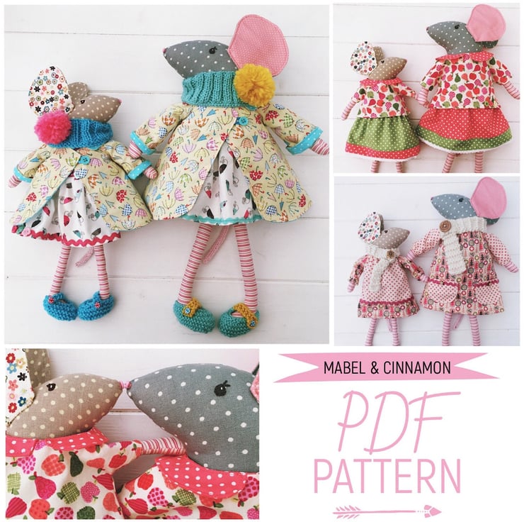 Digital PDF sewing pattern & photo tutorial to make dress up mice cloth dolls featuring the adorable 'Mabel' & her daughter 'Cinnamon'. Pattern includes both mice dolls & 13 items of customizable clothing & accessories.