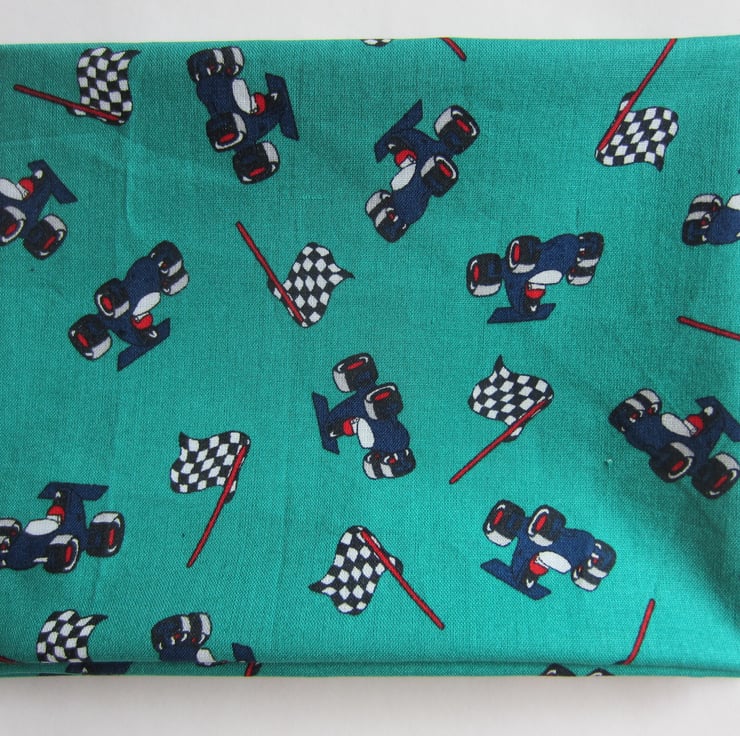 Racing cars and flags on a bright jade coloured background fat quarter. Racing cars are in dark blue, red and white and the chequered flags are black and white with red handles. Each car measures 30 mm x 20 mm approx.