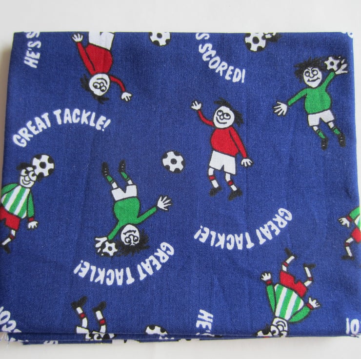 Footballers and footballs in red, green, black and white on a dark blue background. The wording reads Great tackle! and He's scored! Each footballer measures about 4 x 3 cm and the fat quarter measures 70 x 54 cm.
