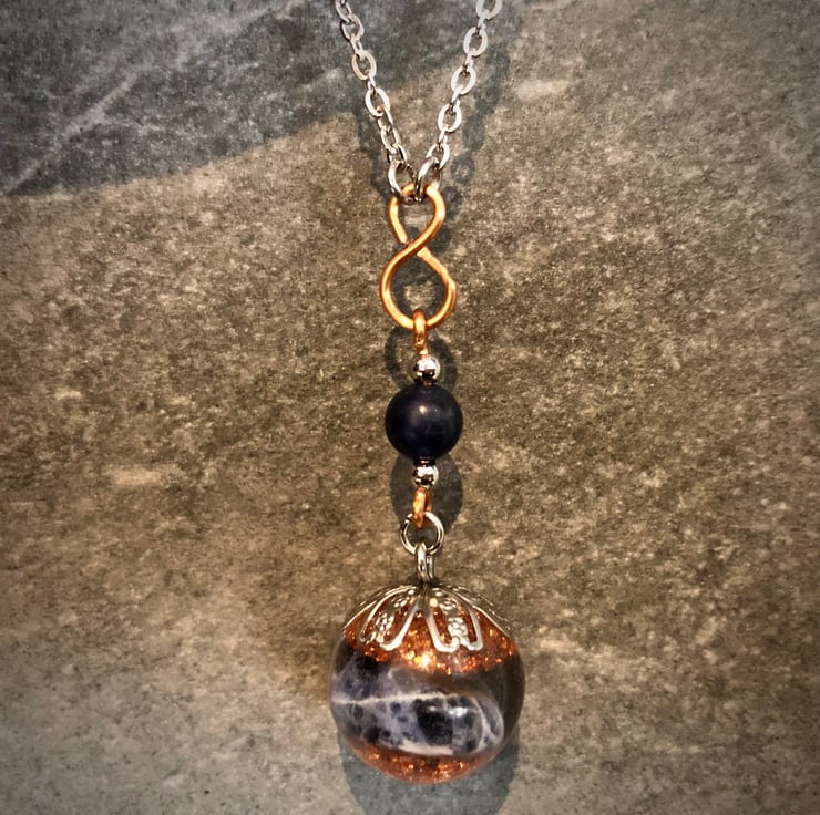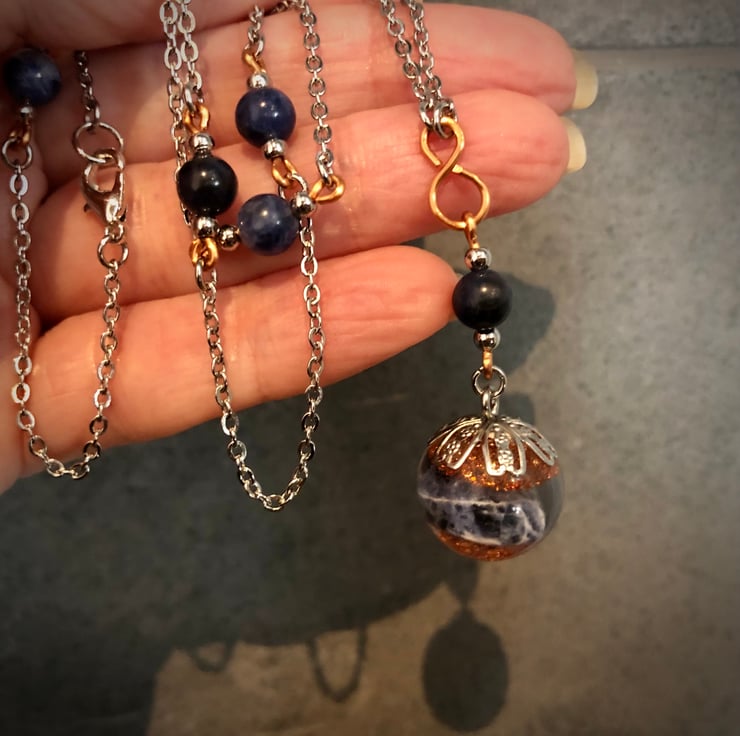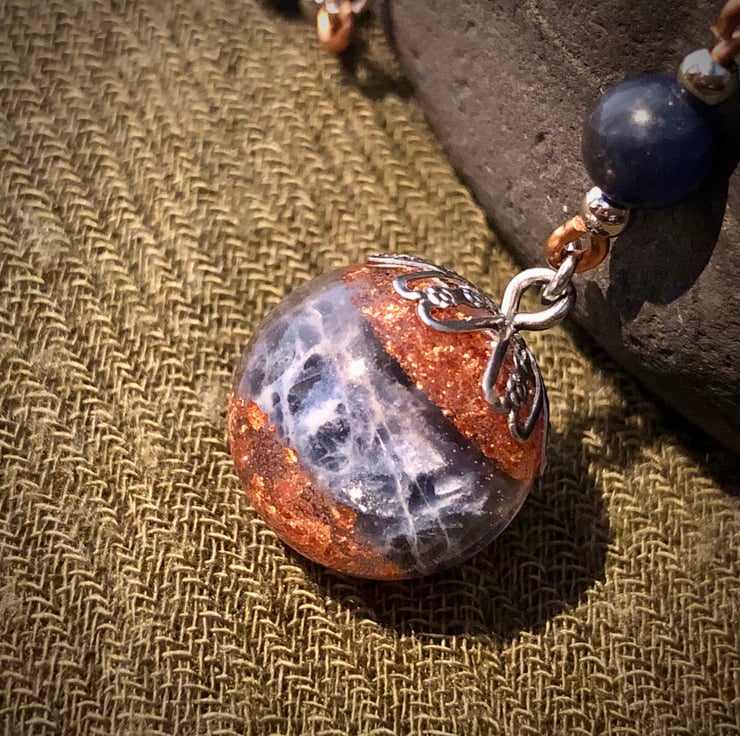 A beautiful Sphere Drop pendant design encasing Sodalite gemstones. These stones have such a wonderful energy, they're certainly one to have in your collection. Copper leaf has also been encased in the resin sphere (measuring 5.5cm in circumference), which compliment the blue and white tones of the Sodalite beautifully.