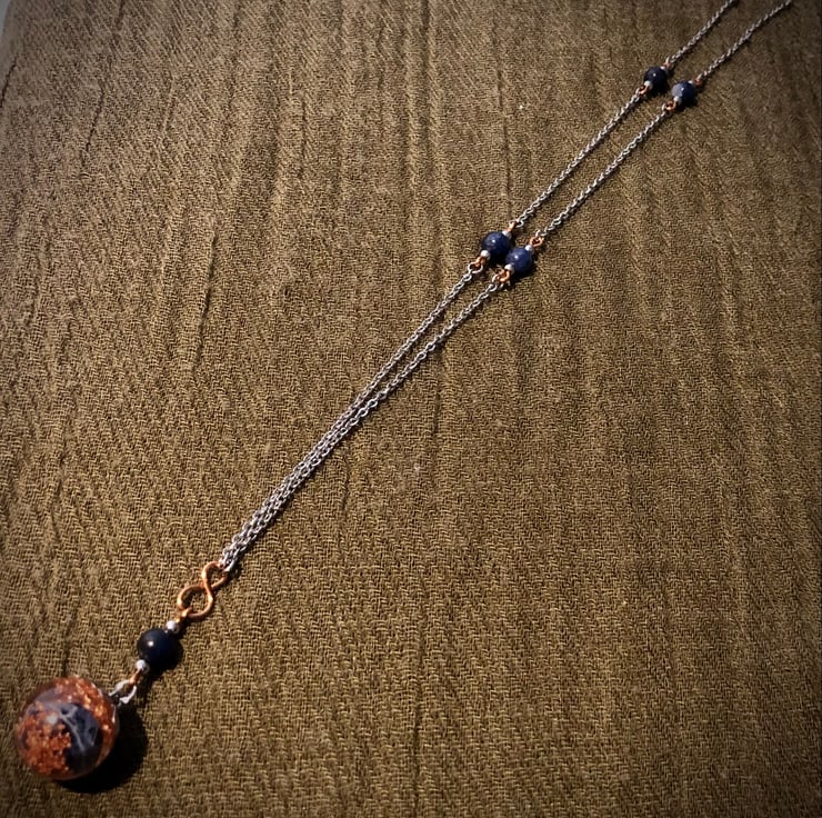 Sodalite gemstones have also been incorporated into the design of the 22 inch stainless steel chain with copper links and stainless steel micro beads.