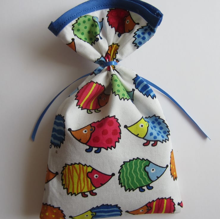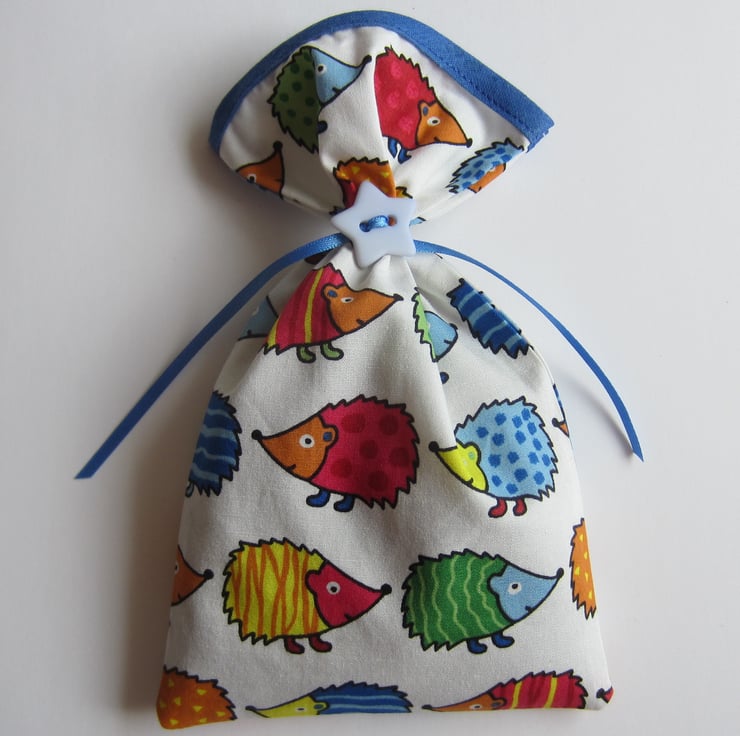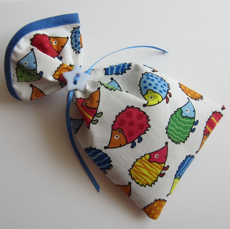 Lavender drawer sachet made from a fabric featuring brightly coloured hedgehogs on a white background.