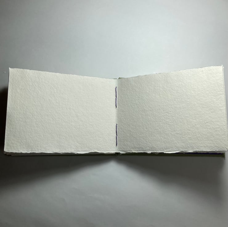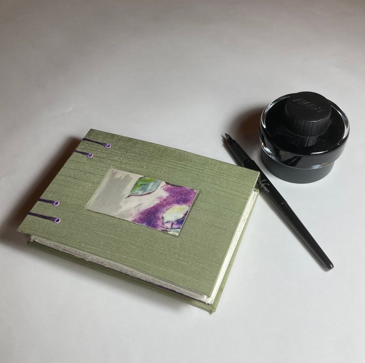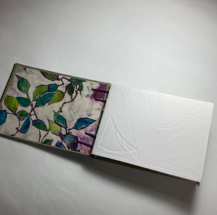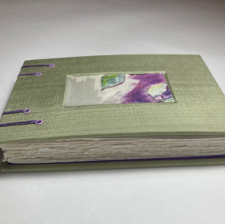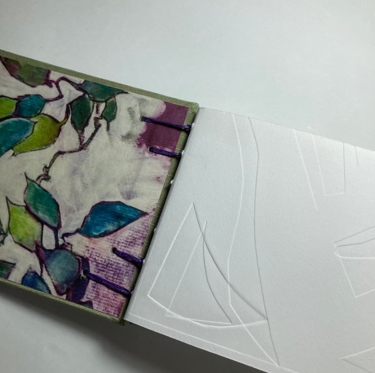 Covered in beautiful silky green bookcloth with a purple floral design and purple stitching, this unique handmade book would make a perfect gift. The original artwork floral design is continued in the inner covers, while the endpapers have an embossed design (eco printing!) Measuring 11.5 x 15.5 x 2.5, it is filled with pages of handmade (Khadi) paper and is suitable for sketching as well as writing.