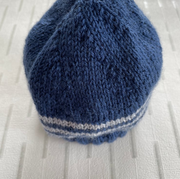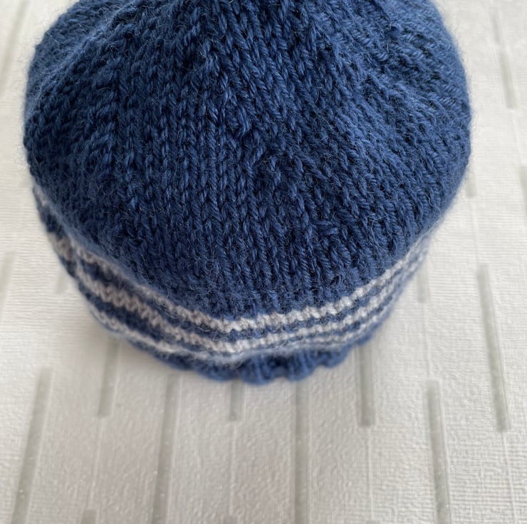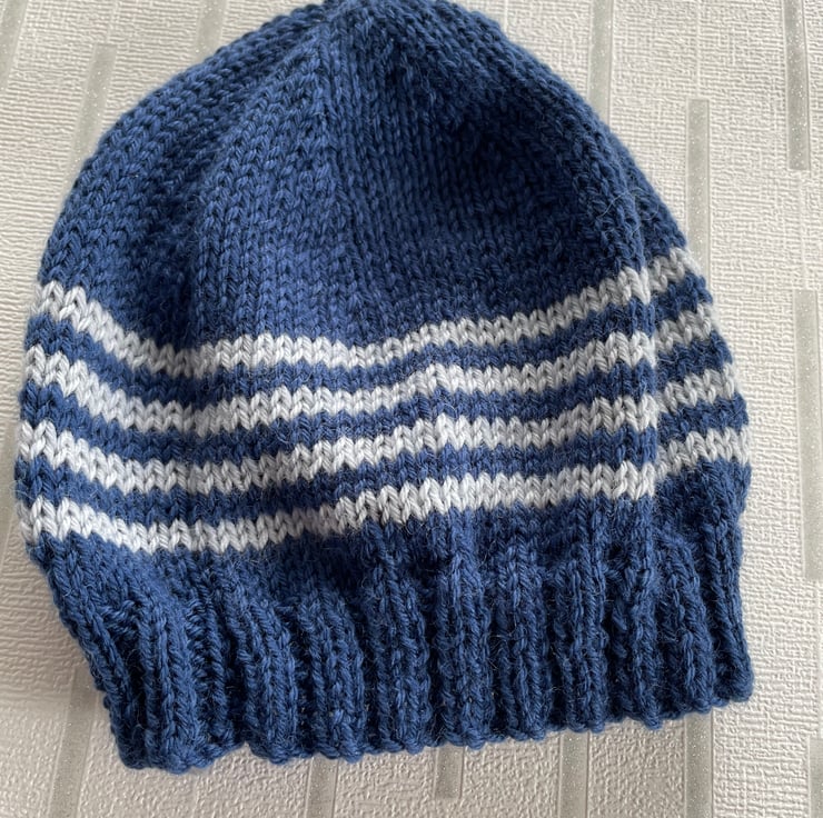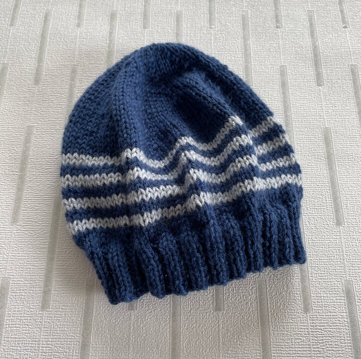 This hat is hand knitted in a quality mixed fibre French yarn. It is worked in navy blue and has four grey stripes near the bottom.