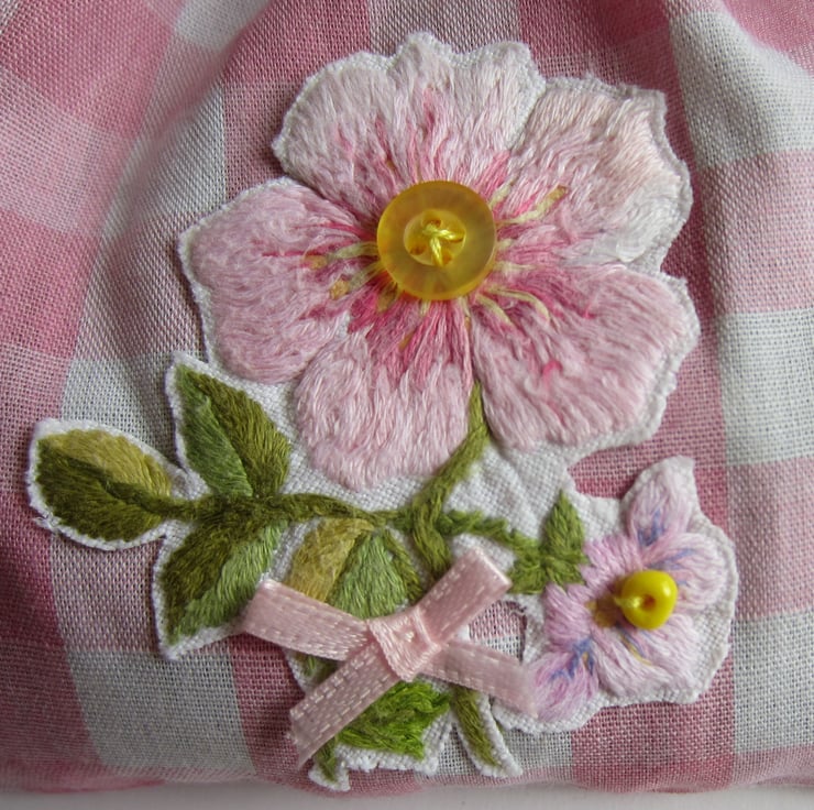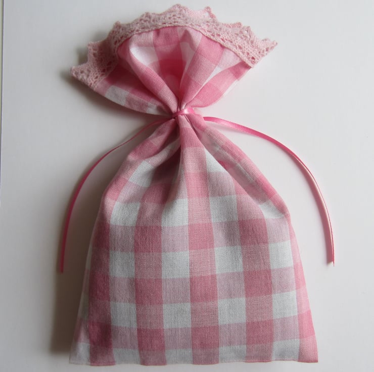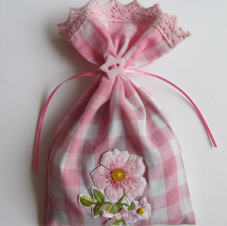 £1 will be donated to the British Red Cross Ukraine Appeal from the sale of this item. Lavender drawer sachet made from pink gingham and decorated with an appliqued vintage embroidery flower and a button, bead and bow.