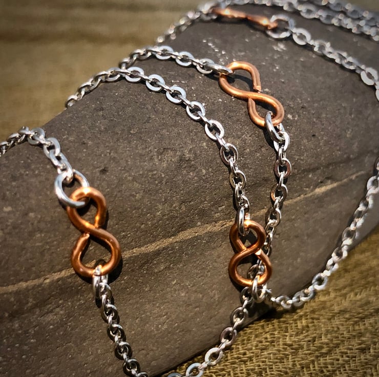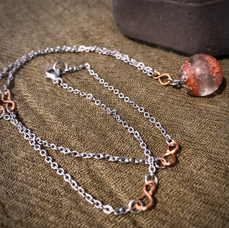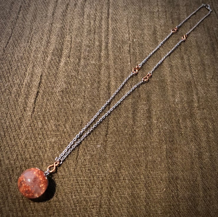 A stainless steel bead cap attaches to a 20.5 inch stainless steel chain featuring 5 copper Infinity symbols and lobster claw fastening. The sphere measures 5.5cm in circumference.