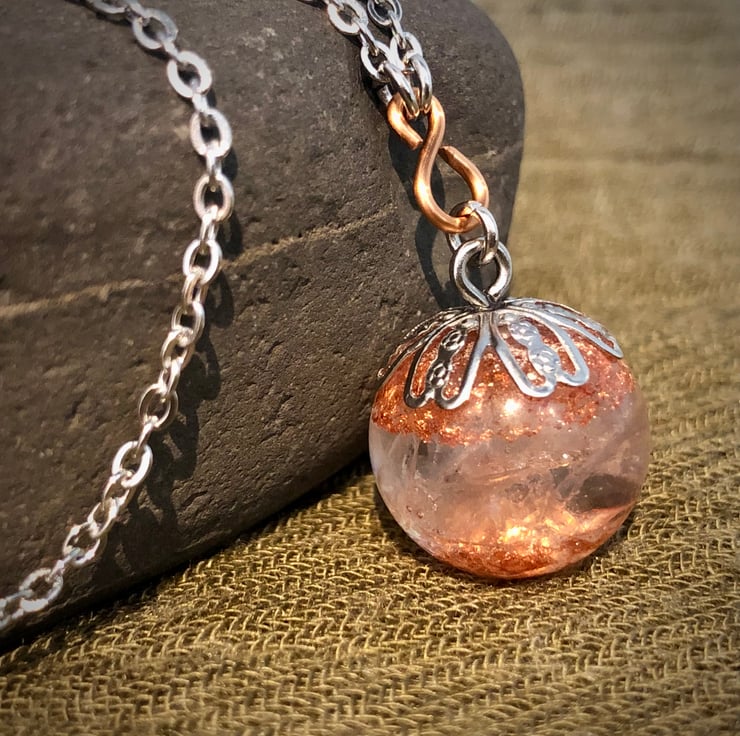 A stunning Sphere Drop Pendant encasing one of my favourite crystals of all time, Clear Quartz! And what amazing energies this pendant radiates. Also encased is copper leaf complimenting the copper Infinity Symbols incorporated in the design of the stainless steel chain. The Infinity symbols signify Limitlessness and Eternity and take this piece to another level.