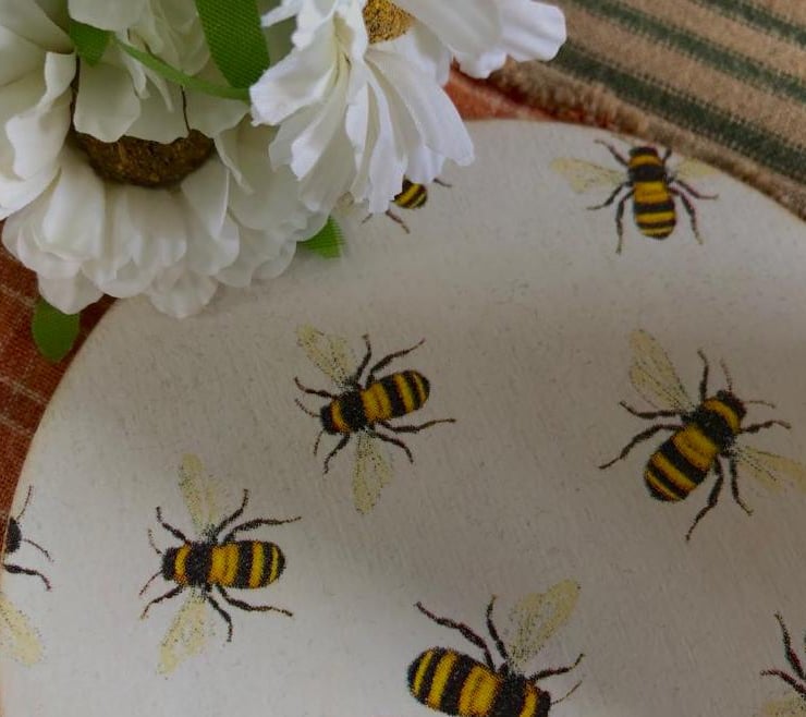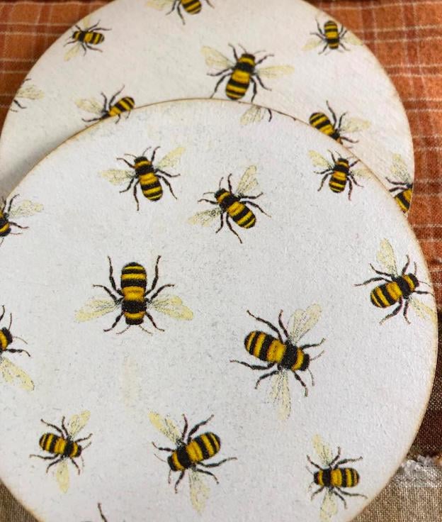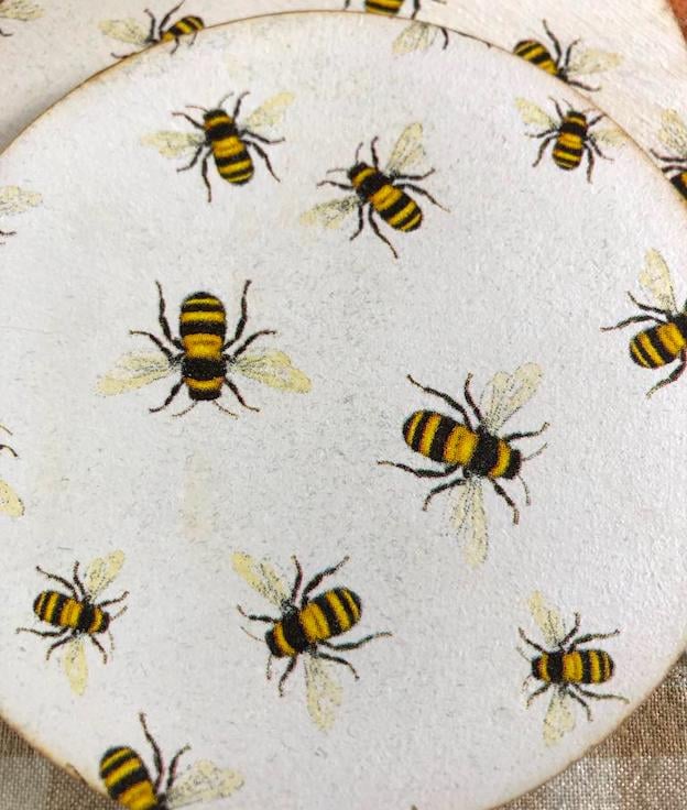 Handmade, circular, decoupage Busy Bee Coaster Set of two. Measuring 11.5 cm these are a generous size coaster and even the largest of mugs or glass will be easily accommodated